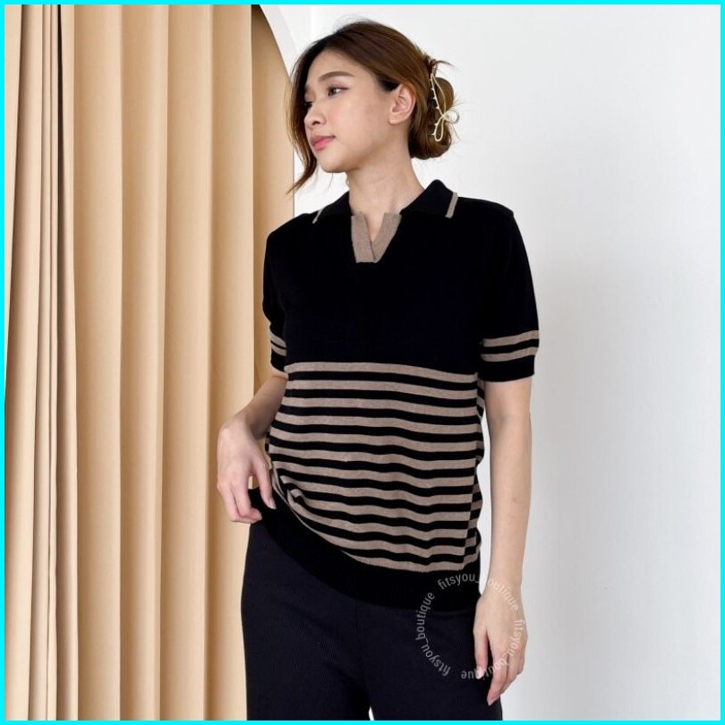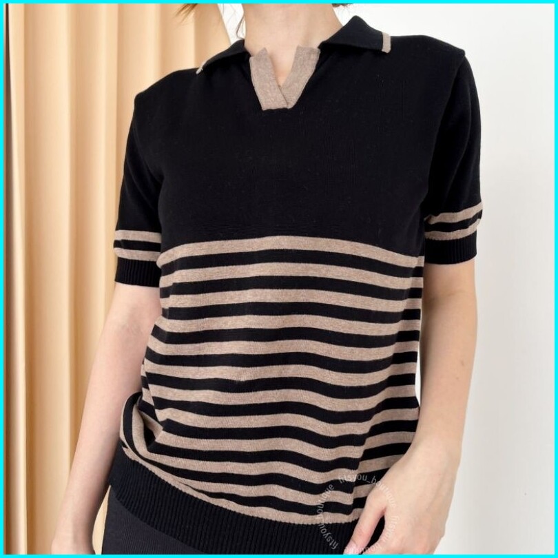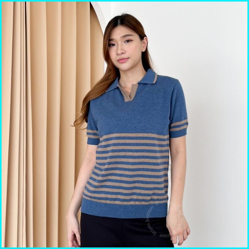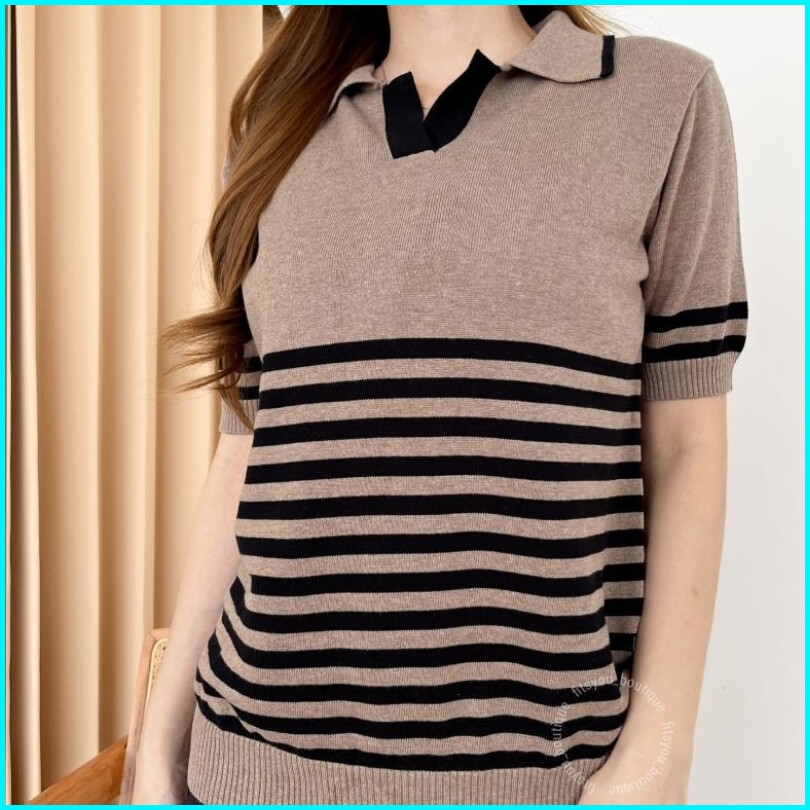 Prinsa Knit Tops Atasan Rajut Katun Wanita Tangan Pendek Garis Halus Adem Serap Keringat Vneck Baju Daily