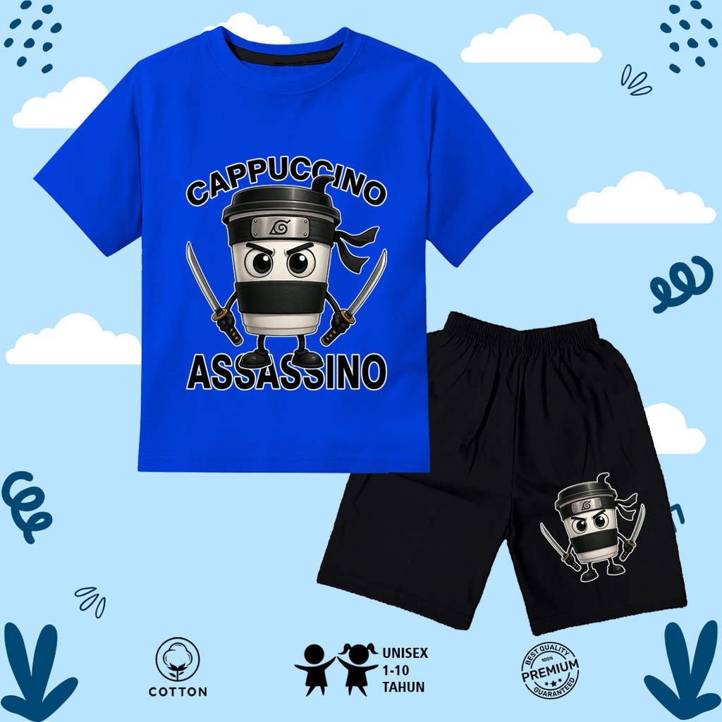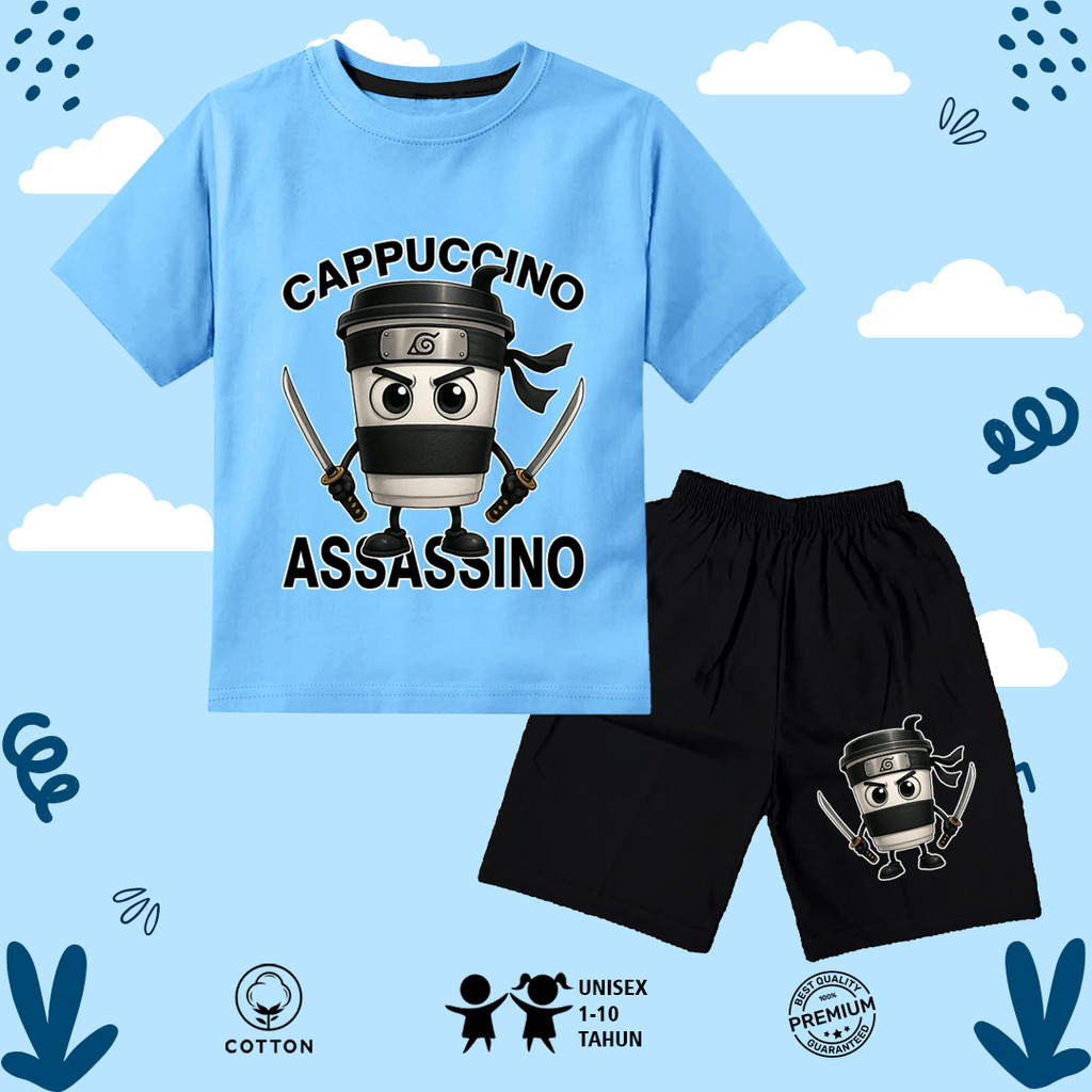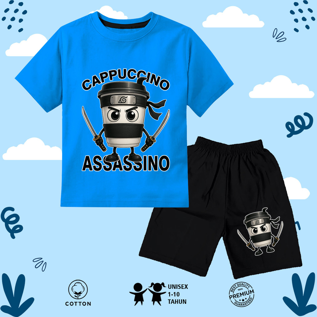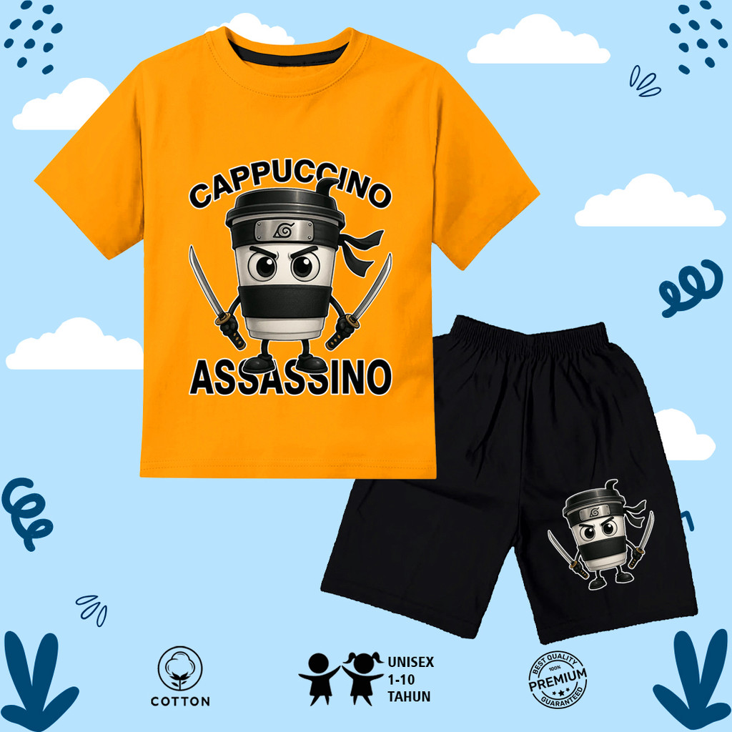 BAJU SETELAN STELAN SET KAOS ANAK COWOK CEWEK LAKI LAKI PEREMPUAN UNISEX MURAH MOTIF ANOMALI CAPPUCCINO ASSASSINO