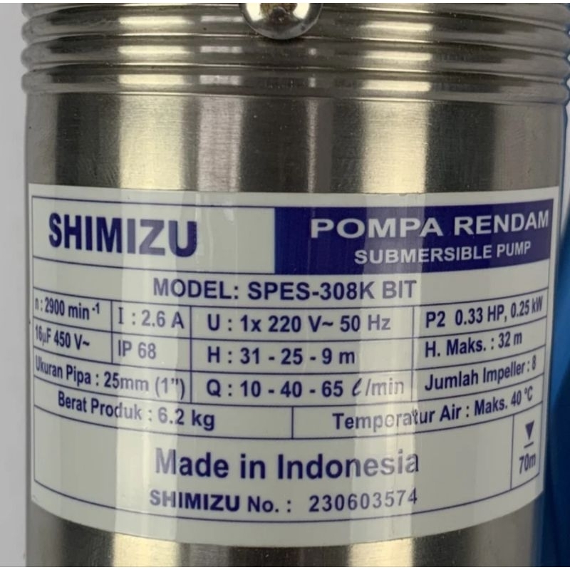 POMPA AIR SATELIT SHIMIZU SPES-308K BIT 0.33 HP + KABEL /POMPA SUBMERSIBLE 1/3 HP 3 INCH
