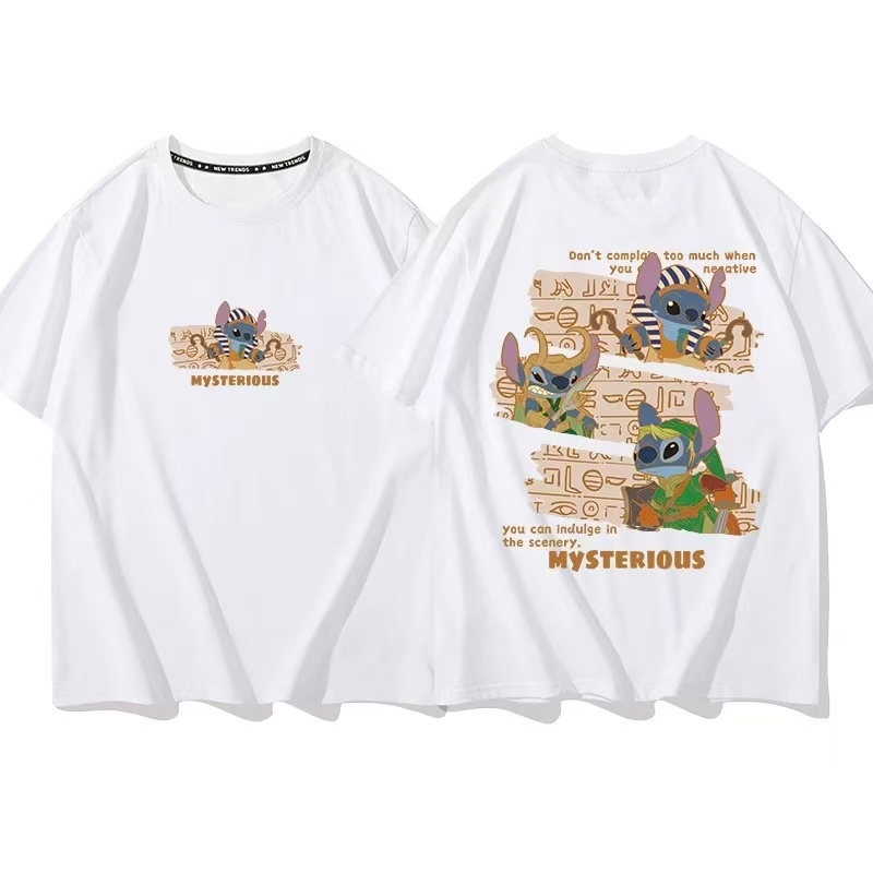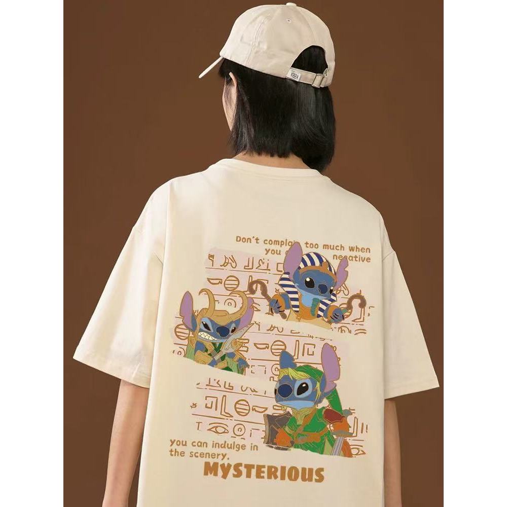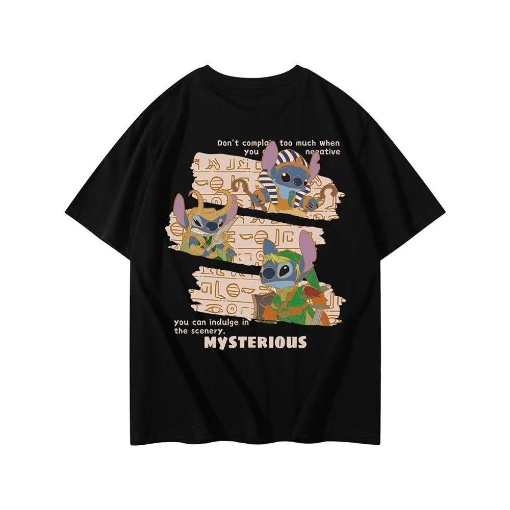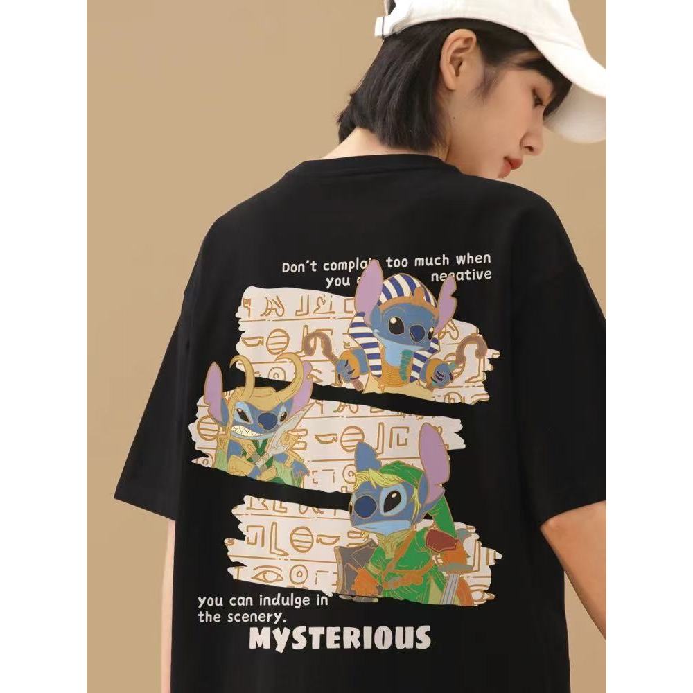Kaos Couple [Print Stitch Lilo & Stitch], Oversized Mode Brand, Lengan Pendek Hitam, Summer 2025, Lebar