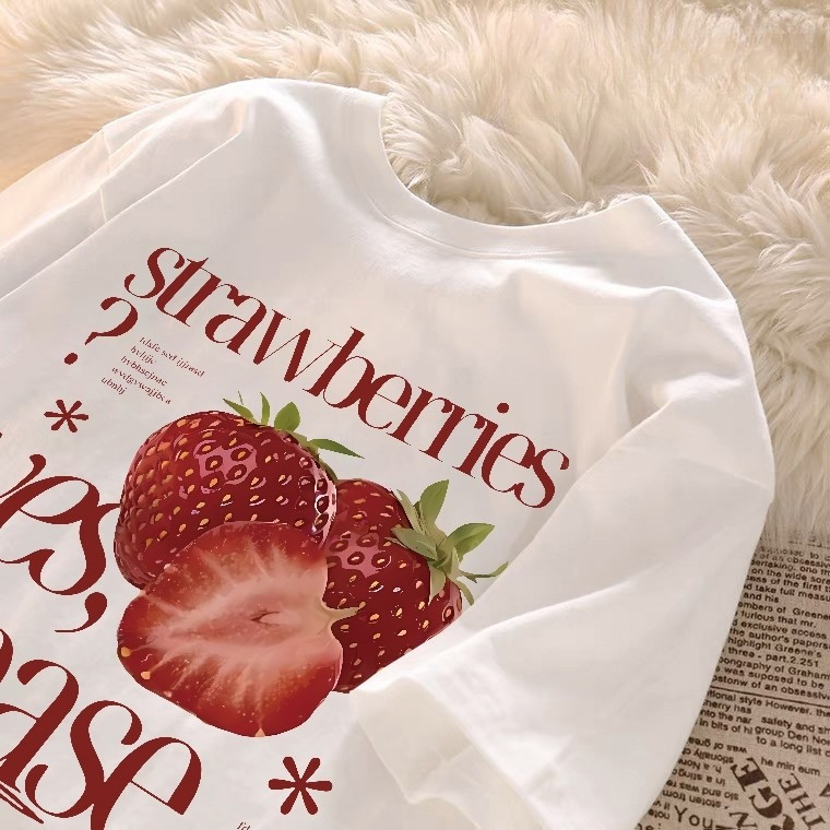 [SIZE S-3XL] Kaos Lengan Pendek Korean Breathable English strawberry print oversized white T-shirt untuk wanita