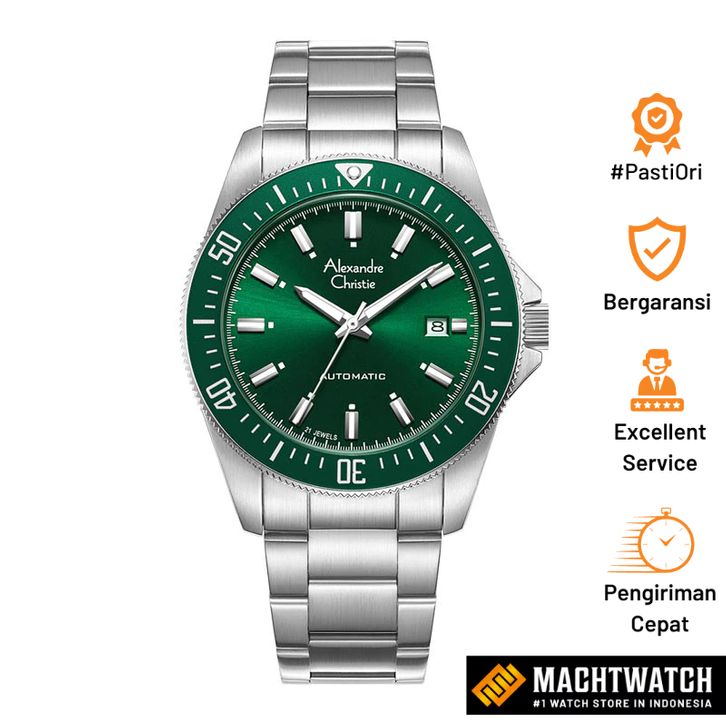 Jam Tangan Pria Alexandre Christie AC 6676 MA BSSGN Men Automatic Green Dial Stainless Steel Strap