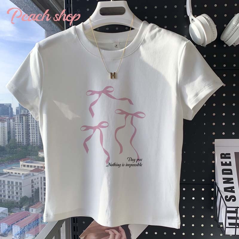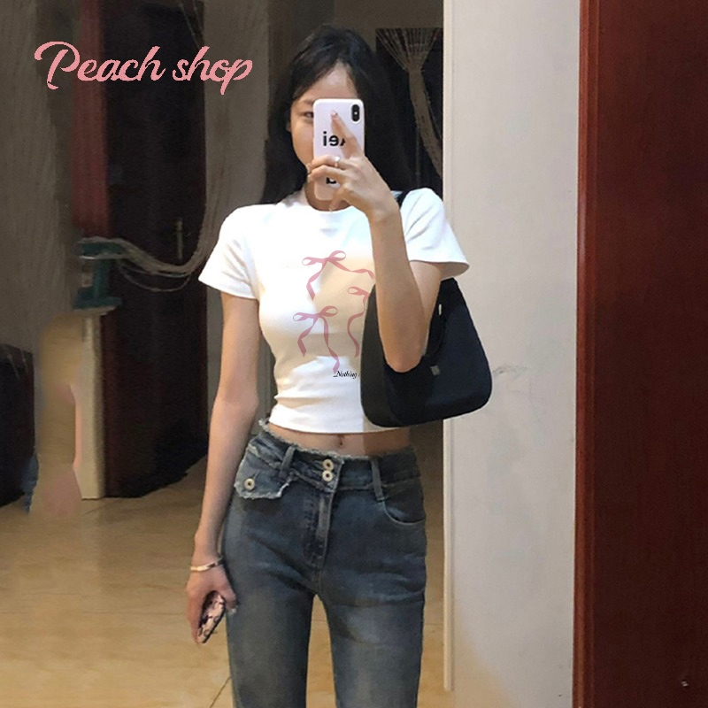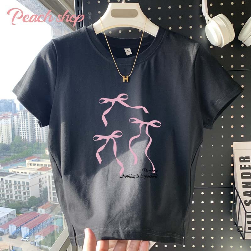 Peach Fashion Cetakan pita busur yang modis T-Shirt Crop Top Lengan Pendek Kaos Wanita Crop Top Crop Wanita Baju Atasan