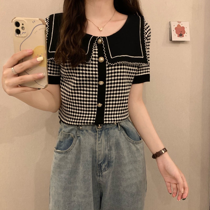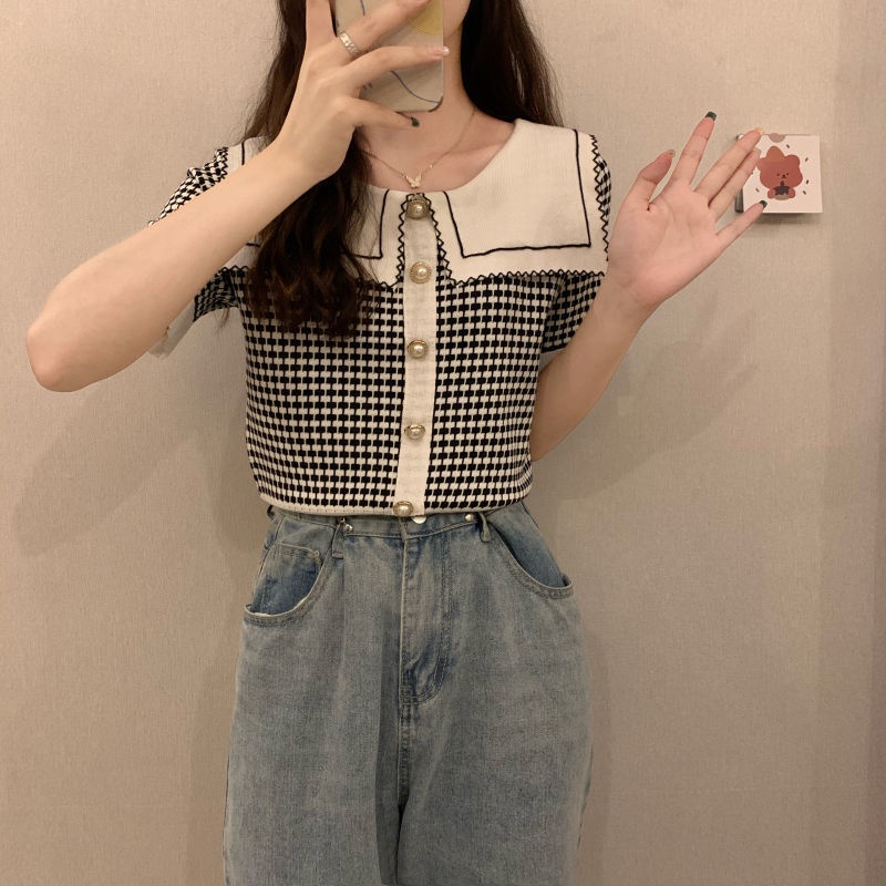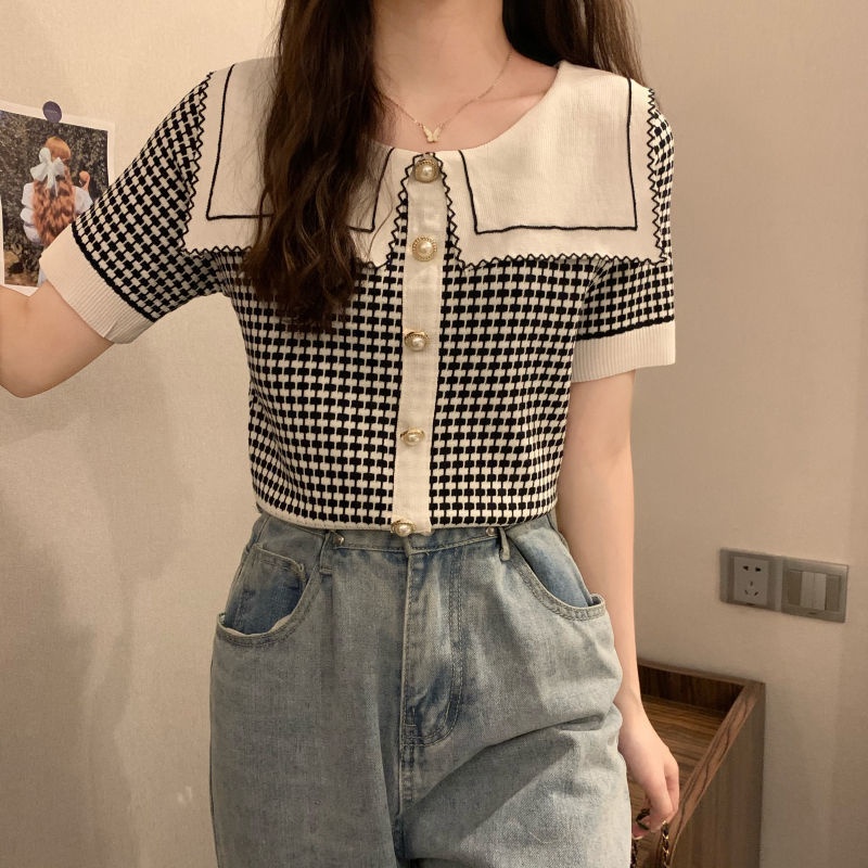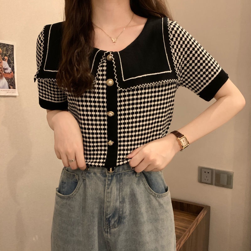 Atasan Rajut Wanita Motif Belang Atasan Lengan Pendek Rajut Korean Top Wanita Motif Houndstooth