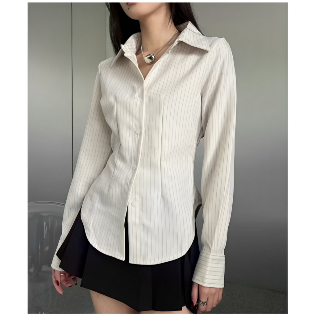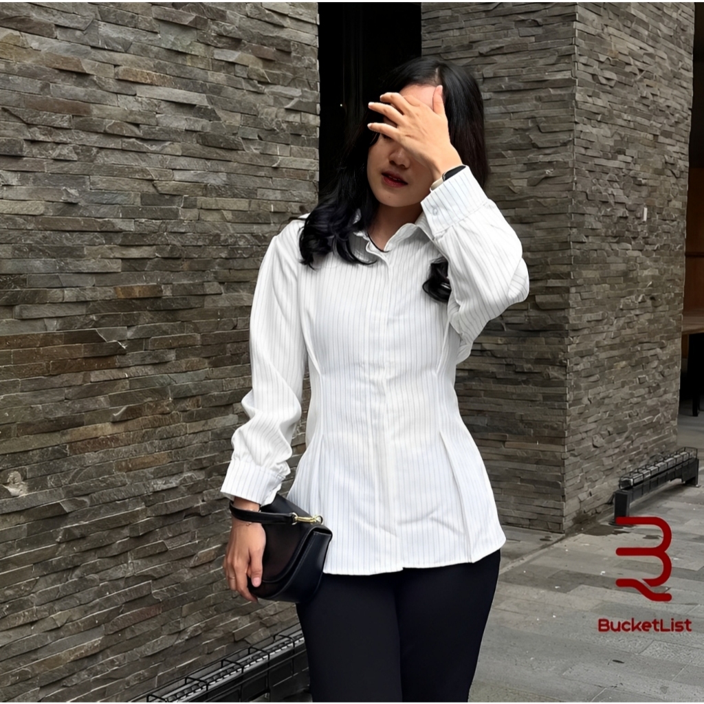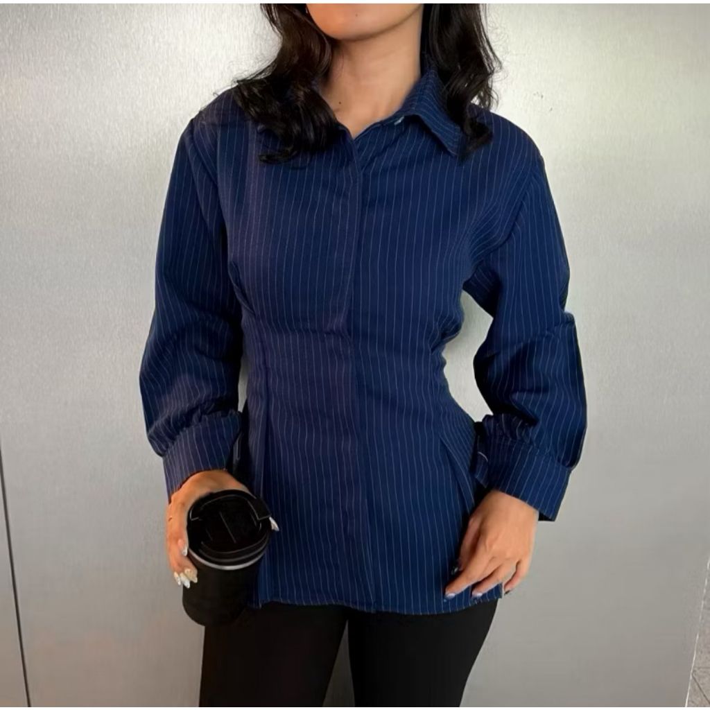 Kemeja Salur Terbaru / Atasan Wanita Salur / Baju Kemeja Wanita Hitam Lengan Panjang Terbaru