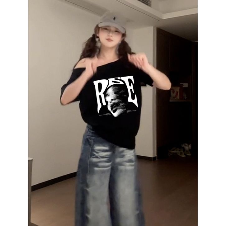 Kaos Atasan Wanita Kekinian Amerika Vintage Tshirt Y2K Asymmetrical Offshoulder Top