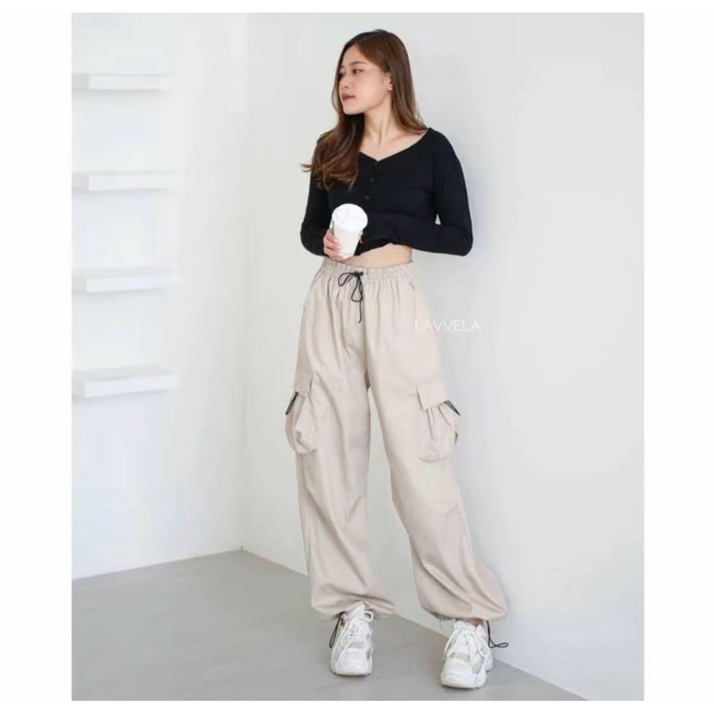 Celana Cargo Serut Wanita Highwaist Premium
