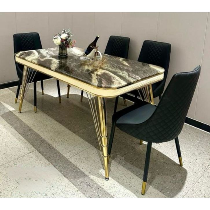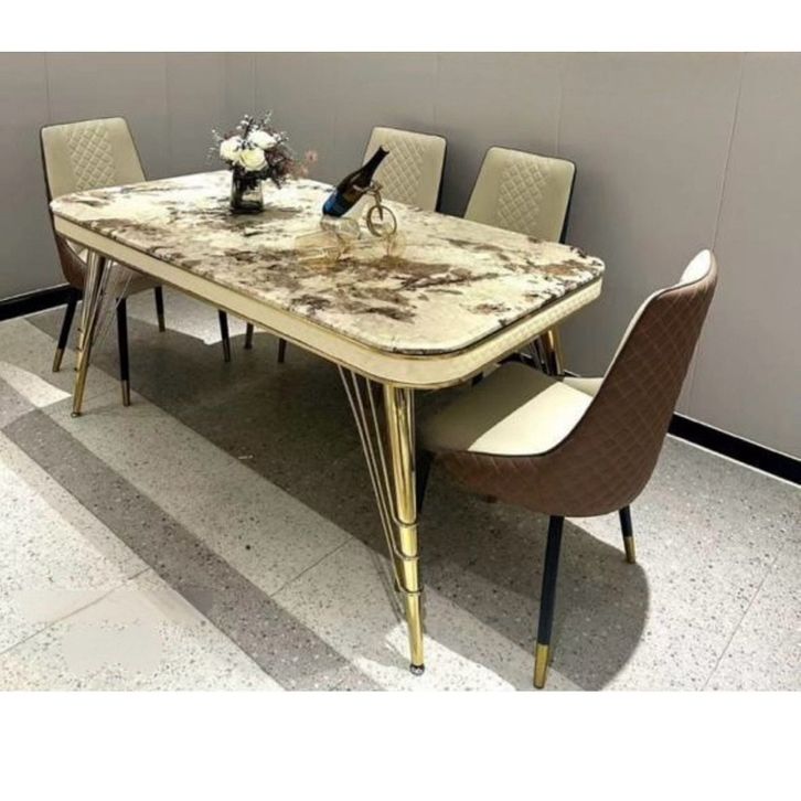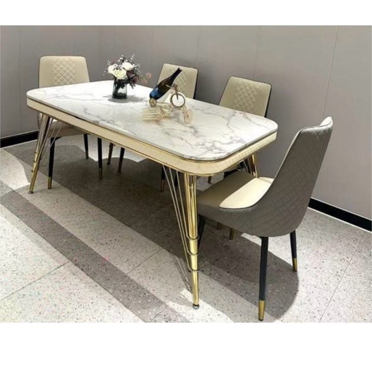 Meja Makan 6 Kursi Marmer Import Type C150 - Set 6 Kursi - Kaki Stainless Gold
