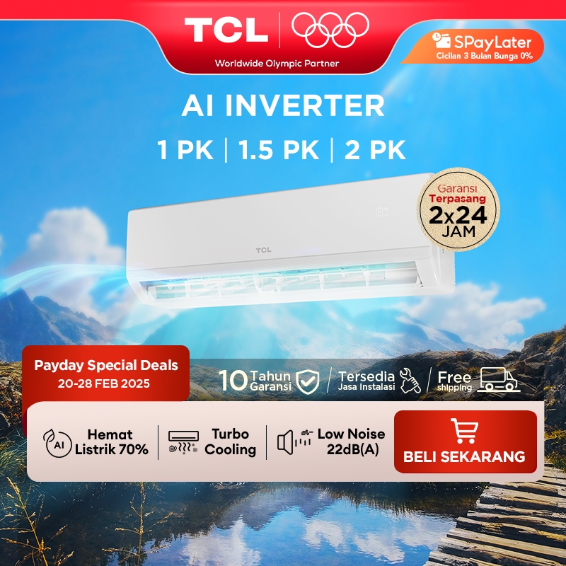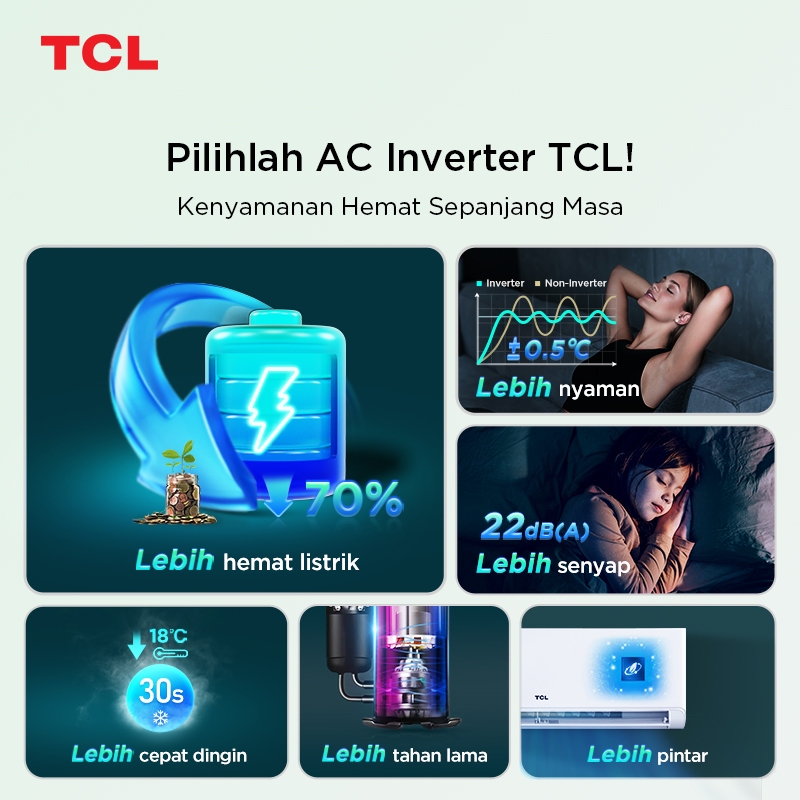 TCL AC AI Inverter XAF SERIES 1 PK / 1.5 PK / 2 PK - Tersedia Pemasangan - AI Tech Hemat Listrik 70 PERSEN - Anti Bising - Cepat Dingin - Turbo Cooling