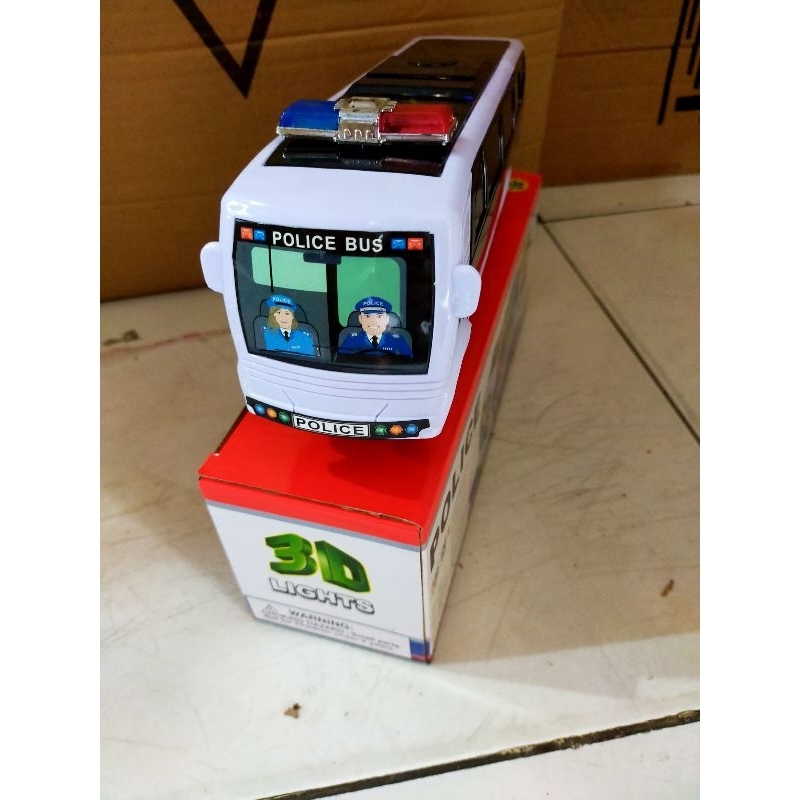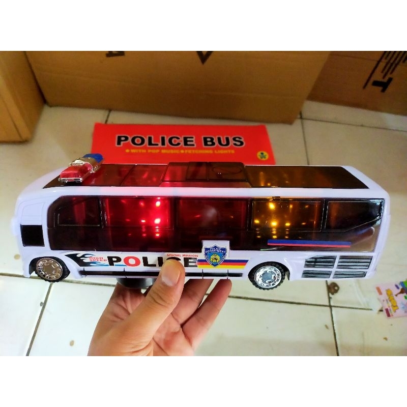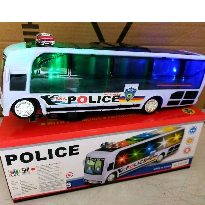 Mobil bus polisi Police jalan dengan lampu dan musik