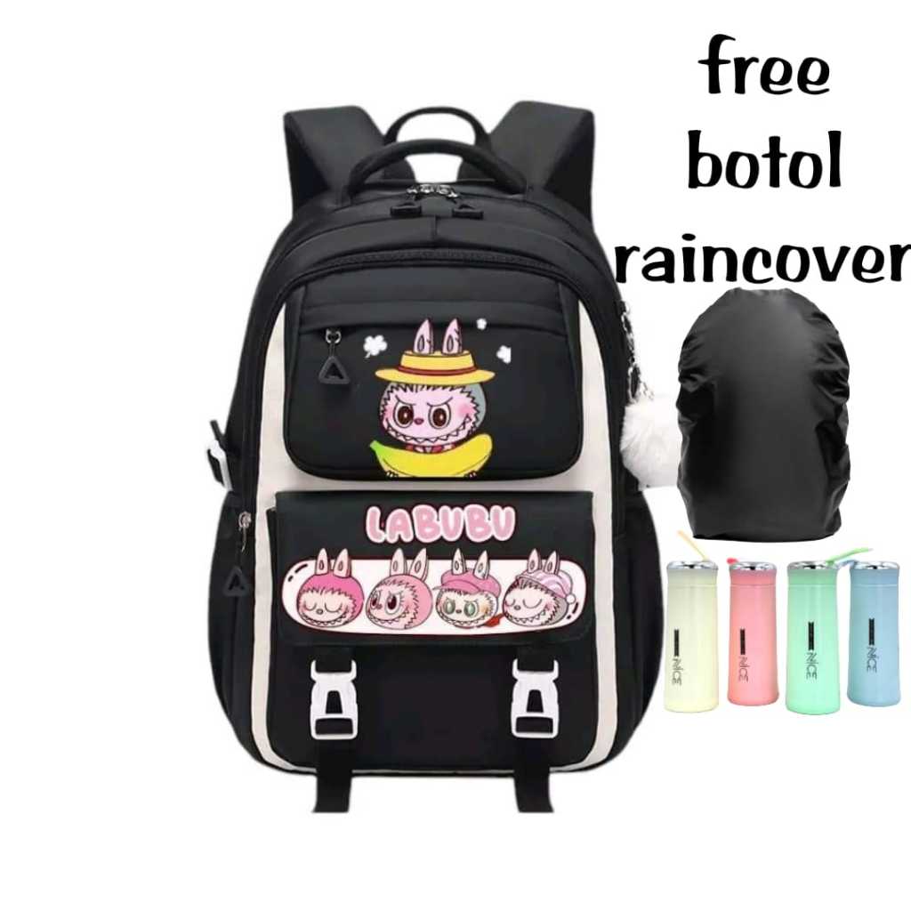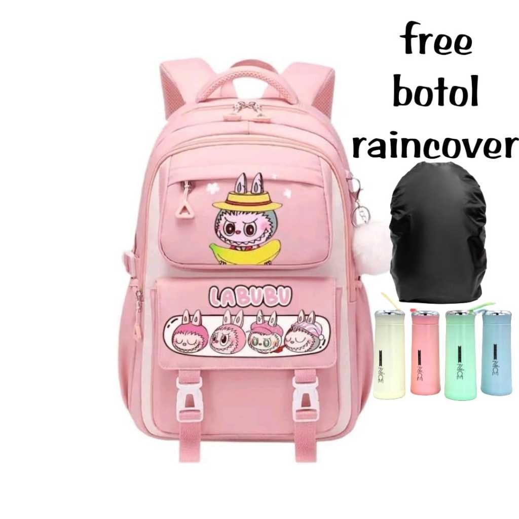 Tas SeKolah LABUBU Ransel Punggung Wanita Tas Sekolah SD Free Botol Minum+Raincover Tas LABUBU Anak
