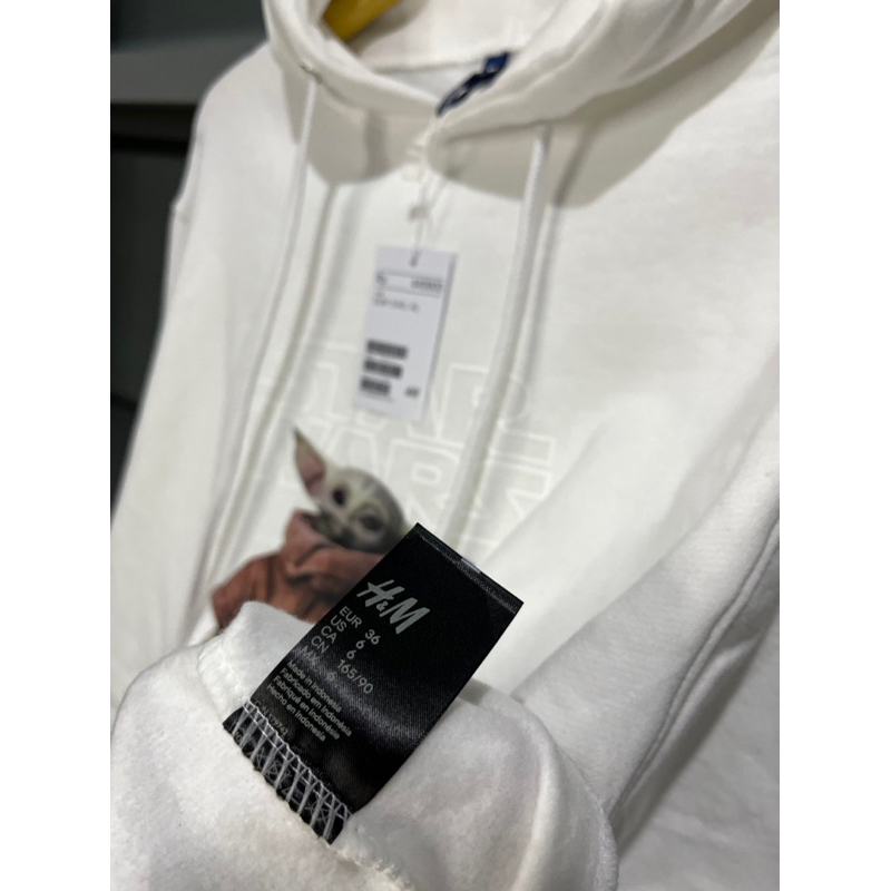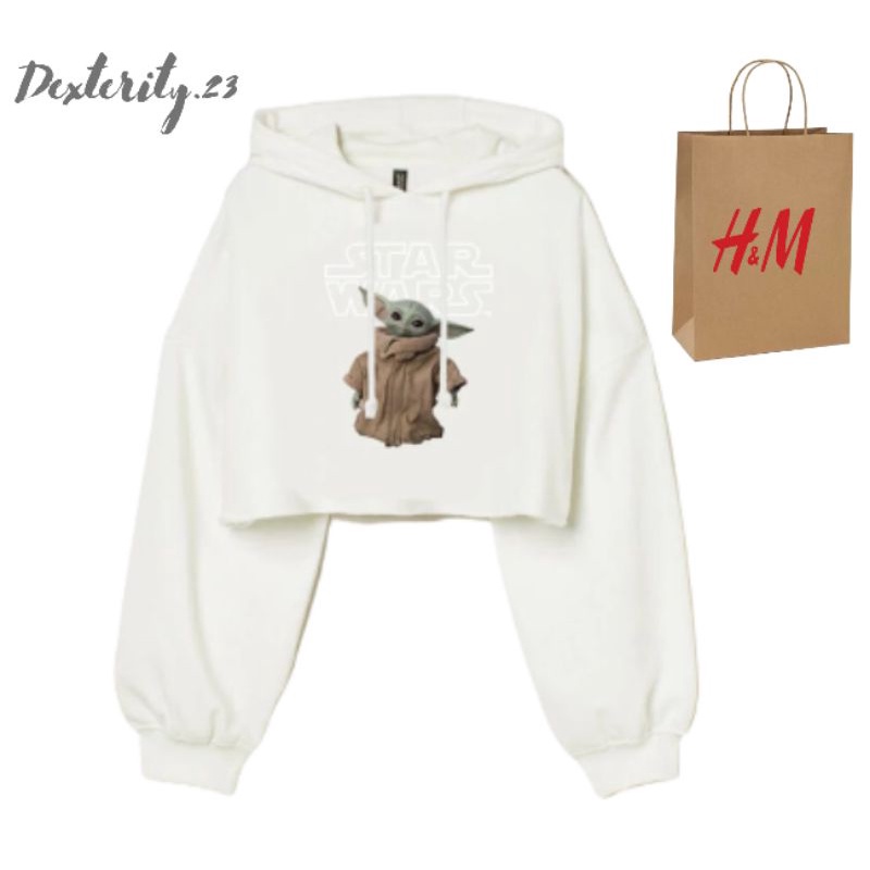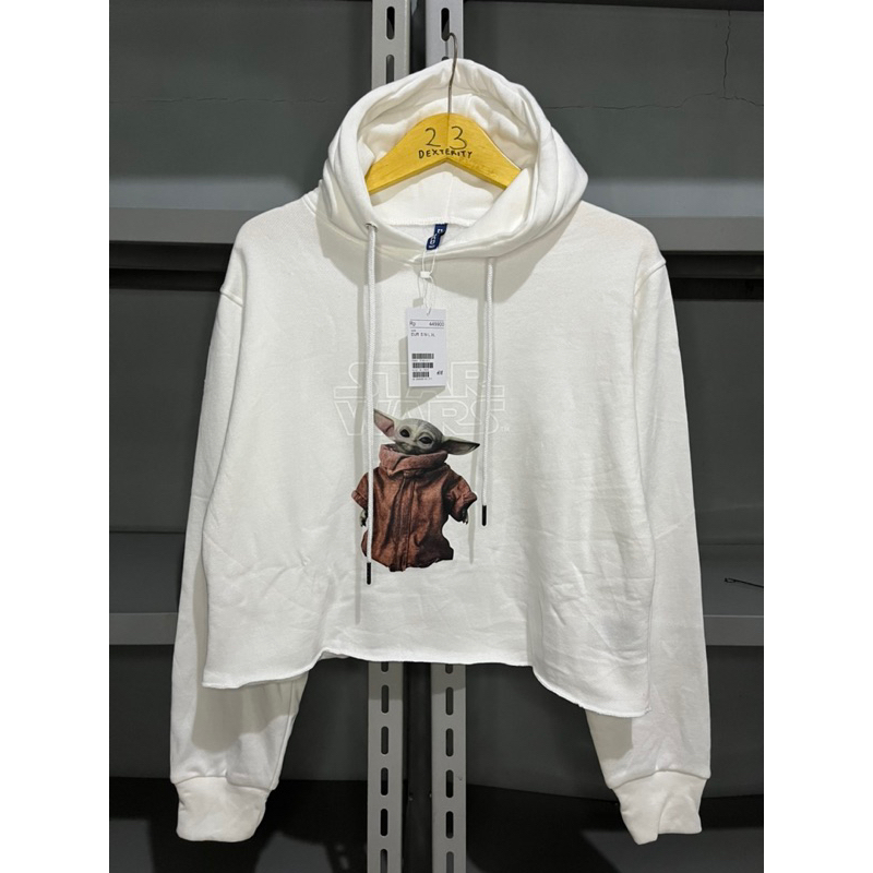 Hoodie Crop HM Uni Star Wars Baby Yoda Broken White Fleece Katun