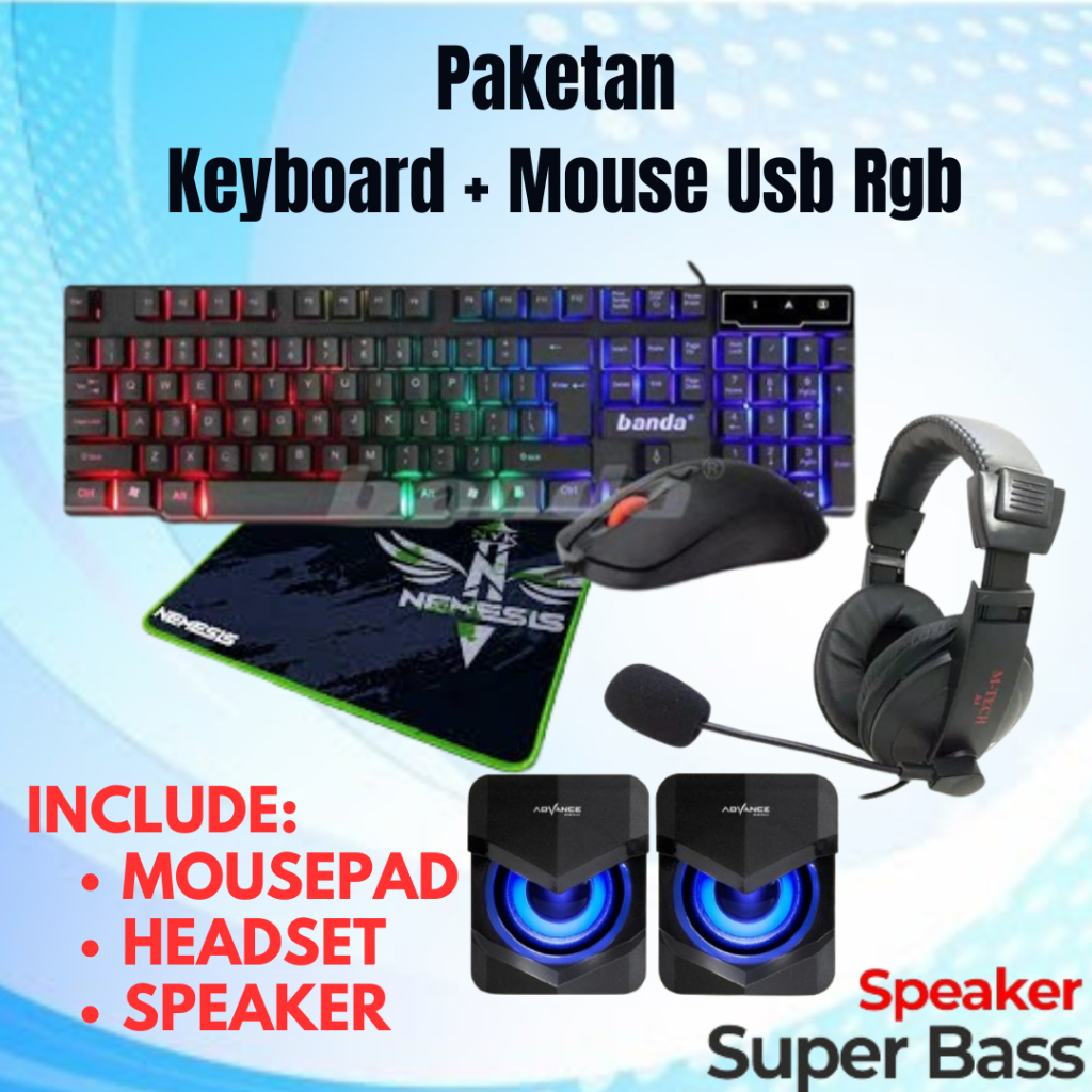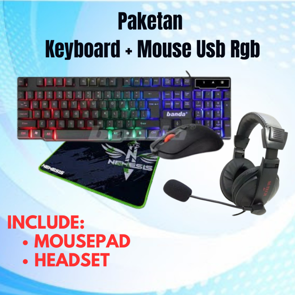 itstore 4 in 1 Pengukiran Laser Paket Gaming Keyboard dan Mouse RGB dan Headset Gaming G12/Set Gaming USB Cable RGB 5in1
