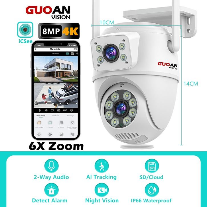 GUOANvision 8MP Kamera CCTV IC SEE Nirkabel Luar Ran Dual-Lensa Suara AI Deteksi Manusia Alarm