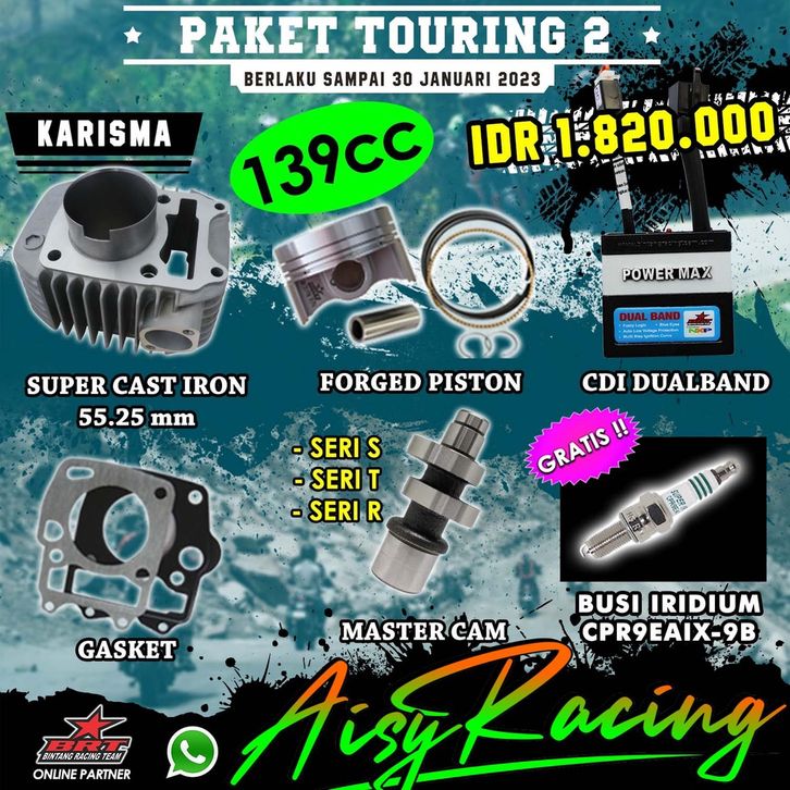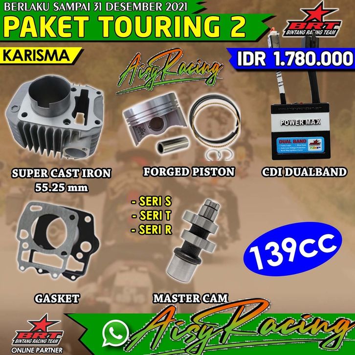 Paket Bore Up BRT Touring 2 Karisma Supra X 125 Kirana 139cc BLOK 55,25 CDI DUALBAND NOKEN AS Busi Iridium