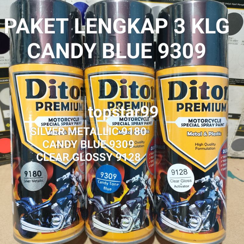 Diton Premium Paket Lengkap 3 Kaleng 400cc Biru Candi Candy Blue 9309 Silver Metalic 9180 Clear Glossy 9128 Pilox Pilok Cat Semprot Spray Paint
