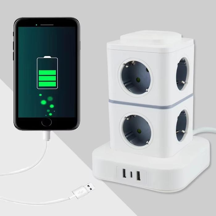 Stop Kontak Vertikal 1.8m - Multi Soket USB Proteksi Kelebihan Beban Steker EU & Kabel Ekstensi 12 Way 0utlets Socket