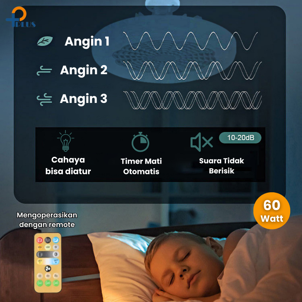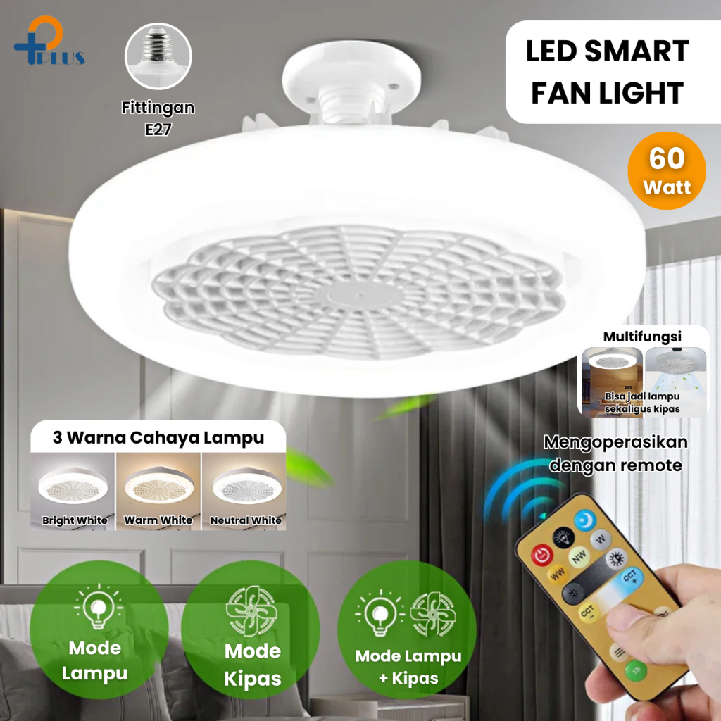[ PPLUS ] LAMPU KIPAS ANGIN AC E27 60W LAMPU LED 60W 3 WARNA + KIPAS ANGIN GANTUNG PLAFON + REMOTE 2 IN 1