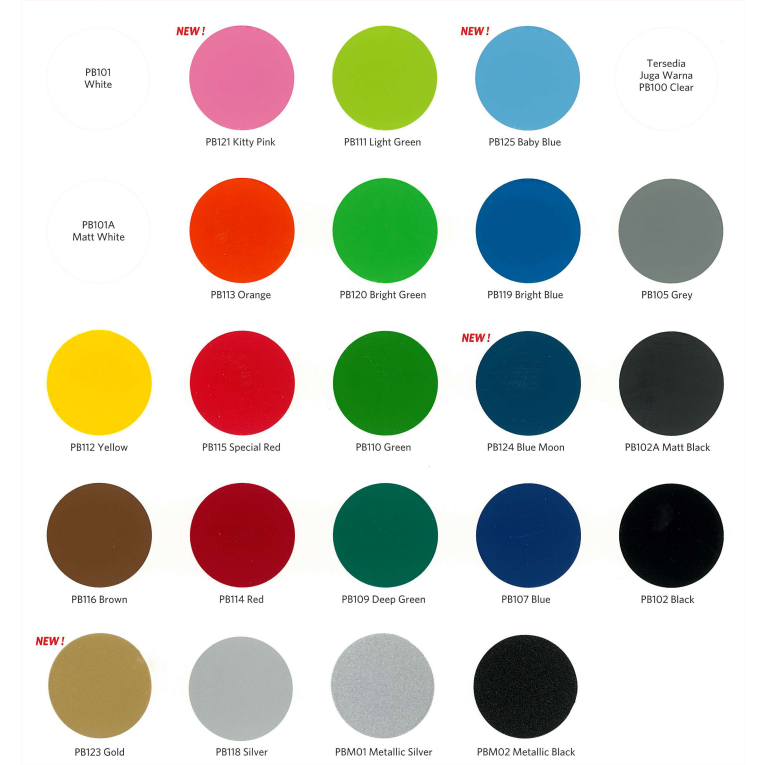 PB110 GREEN, PB113 ORANGE, PB101 WHITE / PUTIH, PB121 KITTY PINK, PB116 BROWN, PB115 SPESIAL RED, PB102 BLACK, PB123 GOLD, PB118 SILVER, PB109 DEEP GREEN