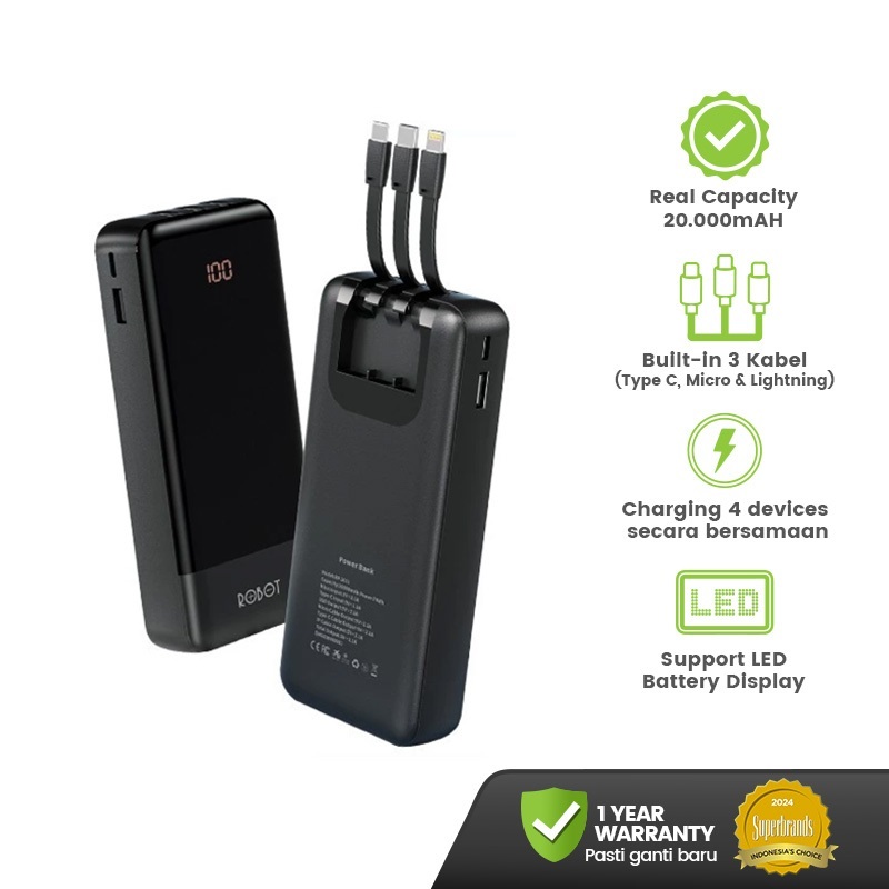 [Mall] Powerbank ROBOT 20000mAH RP-201L 2.1A Dengan 3 Kabel Type C Lightning Micro - Garansi Resmi