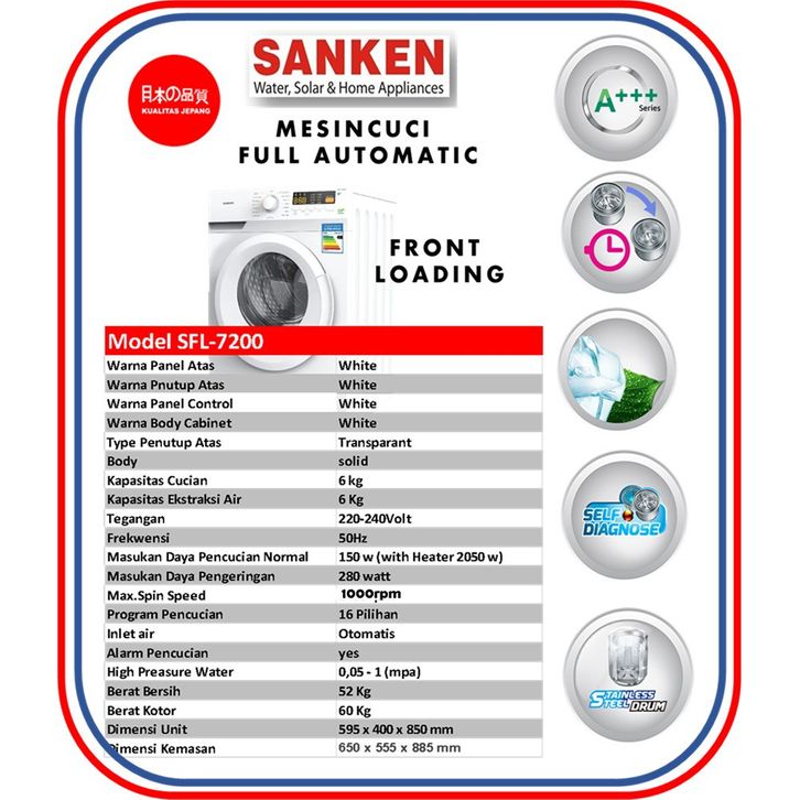 Sanken Mesin Cuci Front Loading 6Kg SFL-7200 Full Automatic