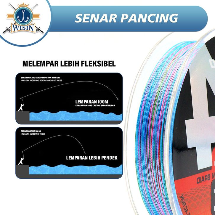 senar pancing anti keriting nilon WISIN Tacofo Benang PE 100M X4 Rainbow Warna Berubah per 10M, Low Visibility & Tahan