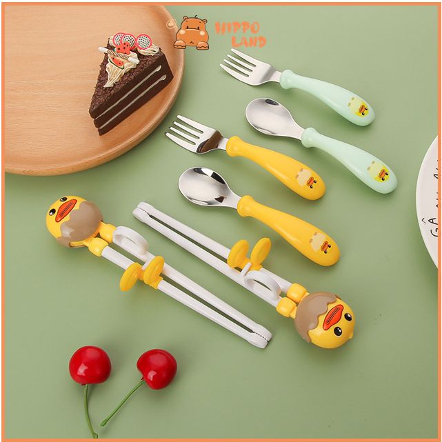 HIPPOLAND 3 in 1 Set alat makan kartun anak Sumpit Pelatihan Bayi Stainless Steel + Sendok + Garpu Set / Peralatan Makan