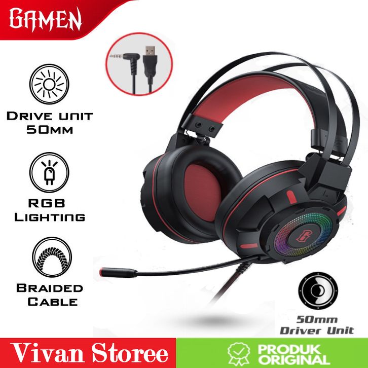 Gamen GH1600 Headset Gaming RGB Led Wired USB dan Jack Audio 3.5mm Connection Headphone Earphone No