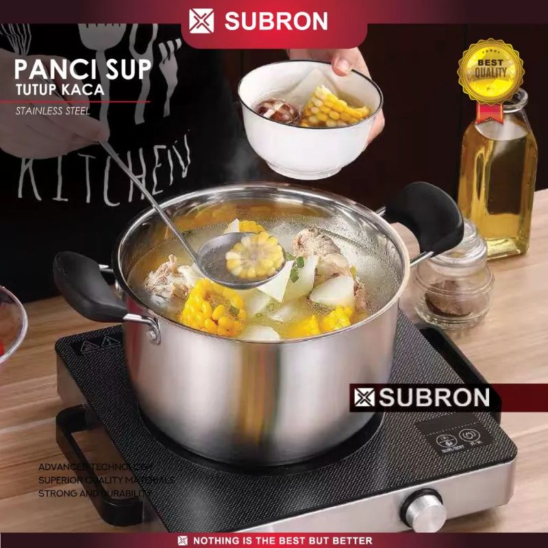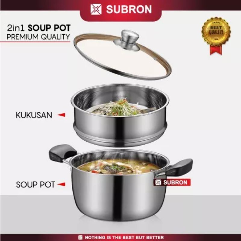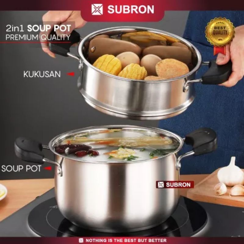 Panci Sup Dengan Steamer Kukus merek Subron 2 SUSUN 20cm 24cm FF2-S20cm FF2-S24cm Panci Sop Kuah Stainless Tebal Berat Premium Bisa Kompor Induksi Tutup Kaca Coklat
