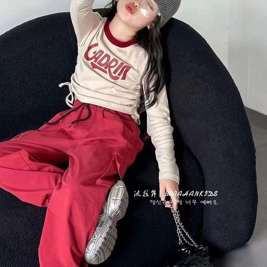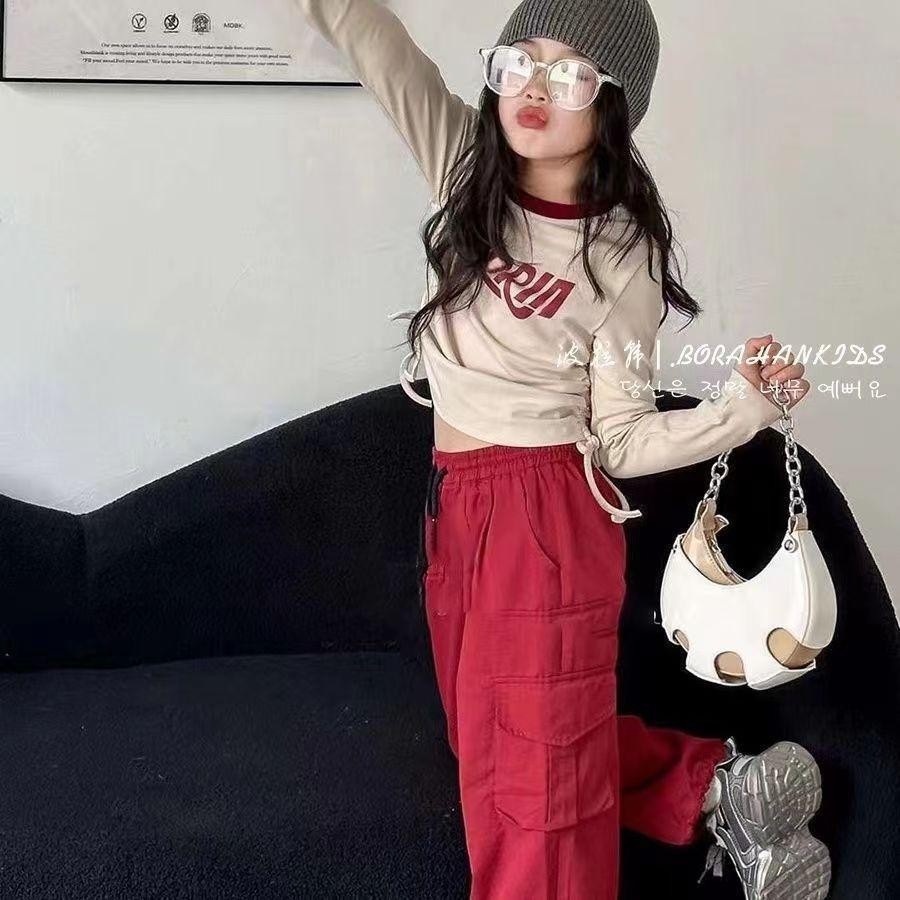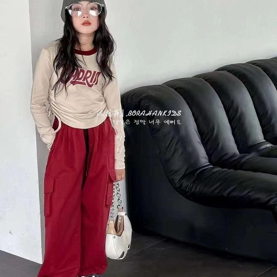 KISSKIDS KOREAN STYLE SETELAN CARGO ANAK PEREMPUAN ATASAN LENGAN PANJANG+CELANA PANJANG WAENA MERAH STYLE OOTD ANAK CEWE