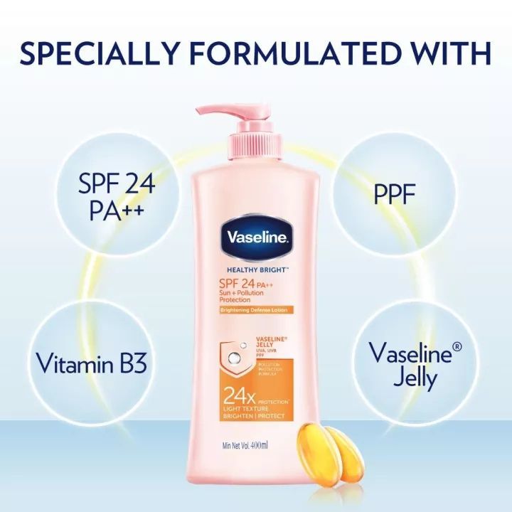 Vaseline Healthy Bright Hand Body Lotion Spf 24 Pa++ Sun Pollution Protection - Healthy White, Lotion Kulit Kusam 400Ml