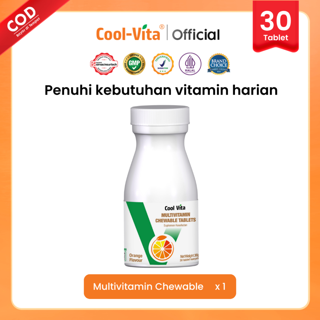 Coolvita Multivitamin Chewable Orange 1 Botol 30 Tablet - Suplemen Kunyah Rasa Jeruk untuk Membantu Memenuhi Kebutuhan Vitamin Harian