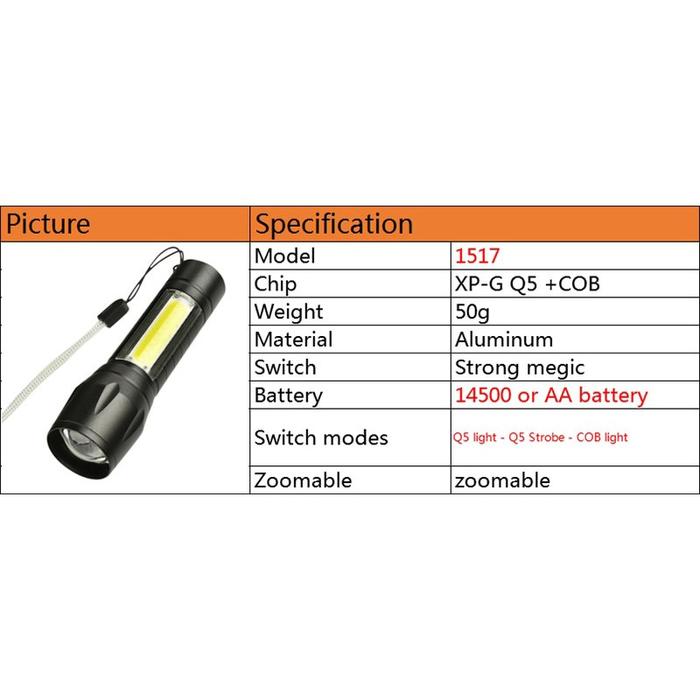 [OUTDOOR STUFF] - TaffLED Albinaly Senter LED USB Rechargeable Q5 + COB 2300 Lumens - 1517 - Black - Warna