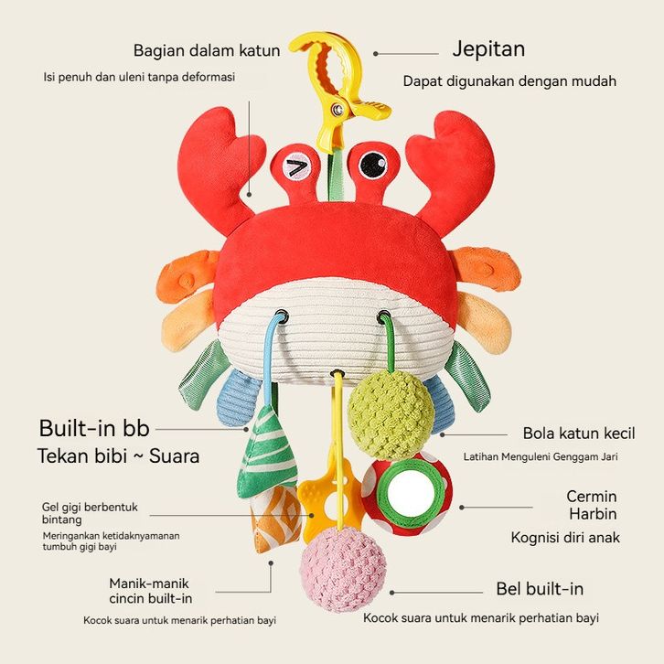 mainan bayi Penjual Lokal 8-in-1 Boneka Gantungan Stroller Bayi Crab Rattle Teether Pull Rope Musik Toy Soft Doll
