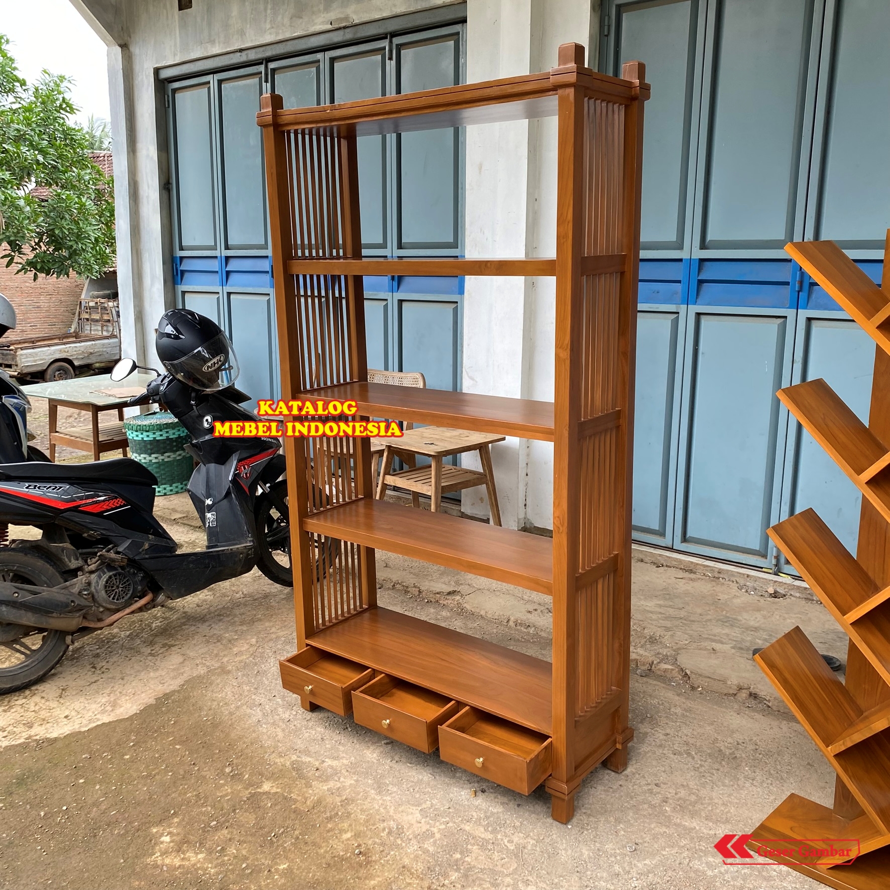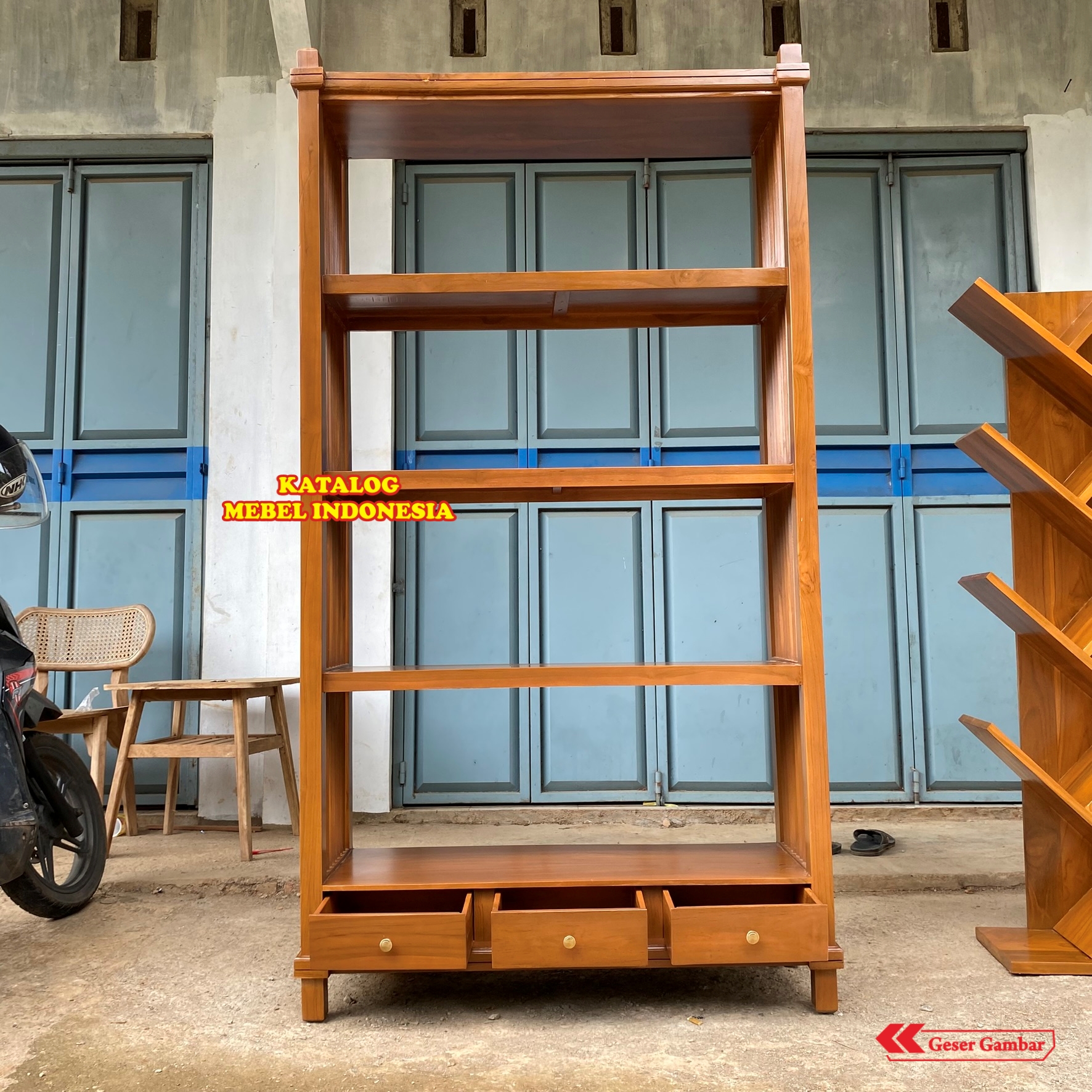 Rak Buku Kayu Jati 3 Laci 4 Tingkat - Lemari Buku Minimalis Display Cabinet