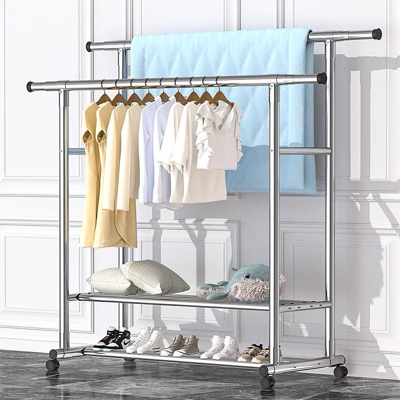 Rak Gantungan Baju Berdiri Stainless Steel Tebal Jemuran Baju Stainless Jemuran baju Dobel Pool Roda
