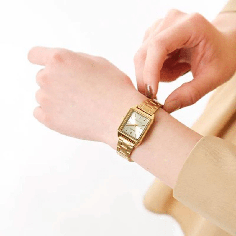 Jam Tangan Wanita Casio General LTP-V007G-9E Tank White Dial Gold Stainless Steel Band