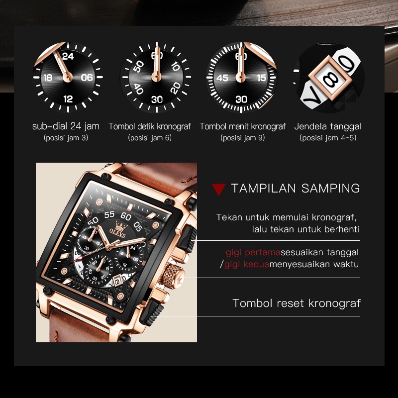OLEVS Jam Tangan Pria Kulit Anti Air Original Asli Terbaru Casual Tahan Air Square Chronograph Leather Dengan Kotak Tanggal Hitam