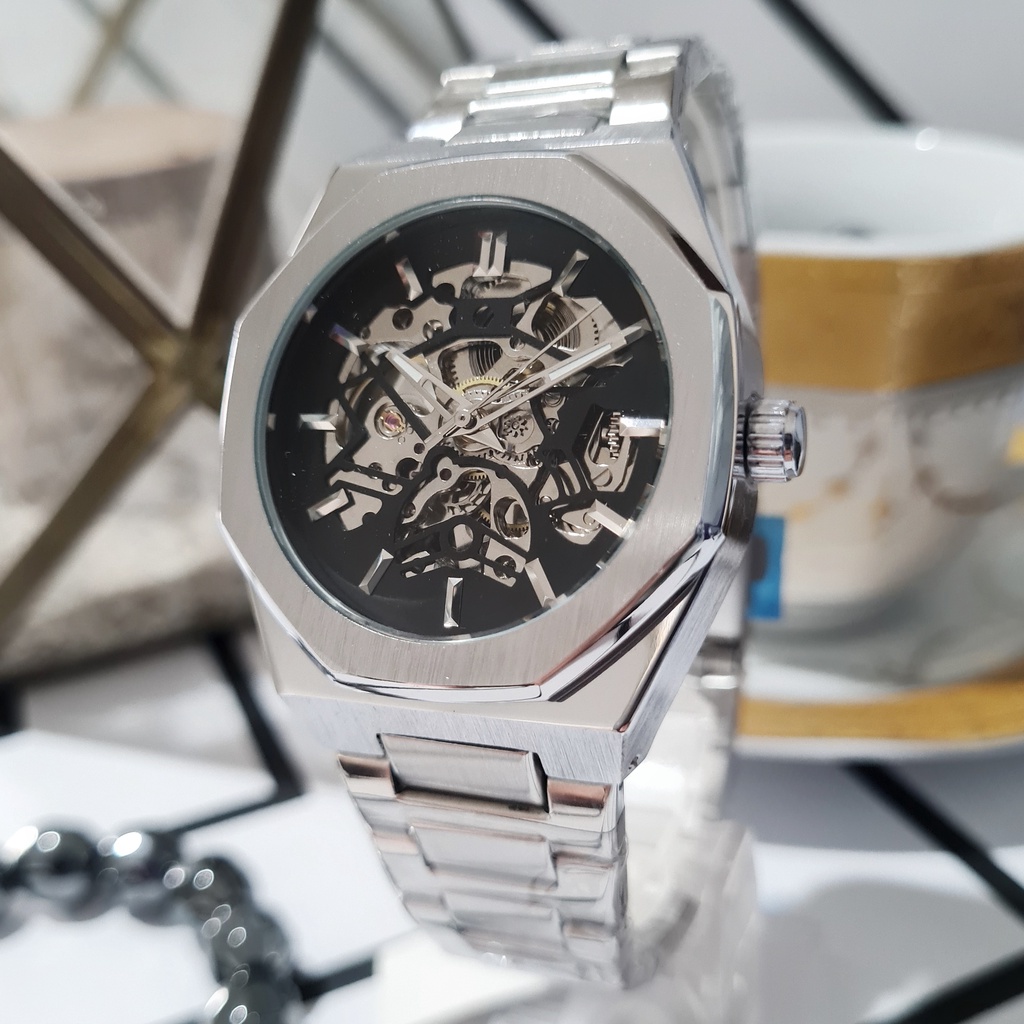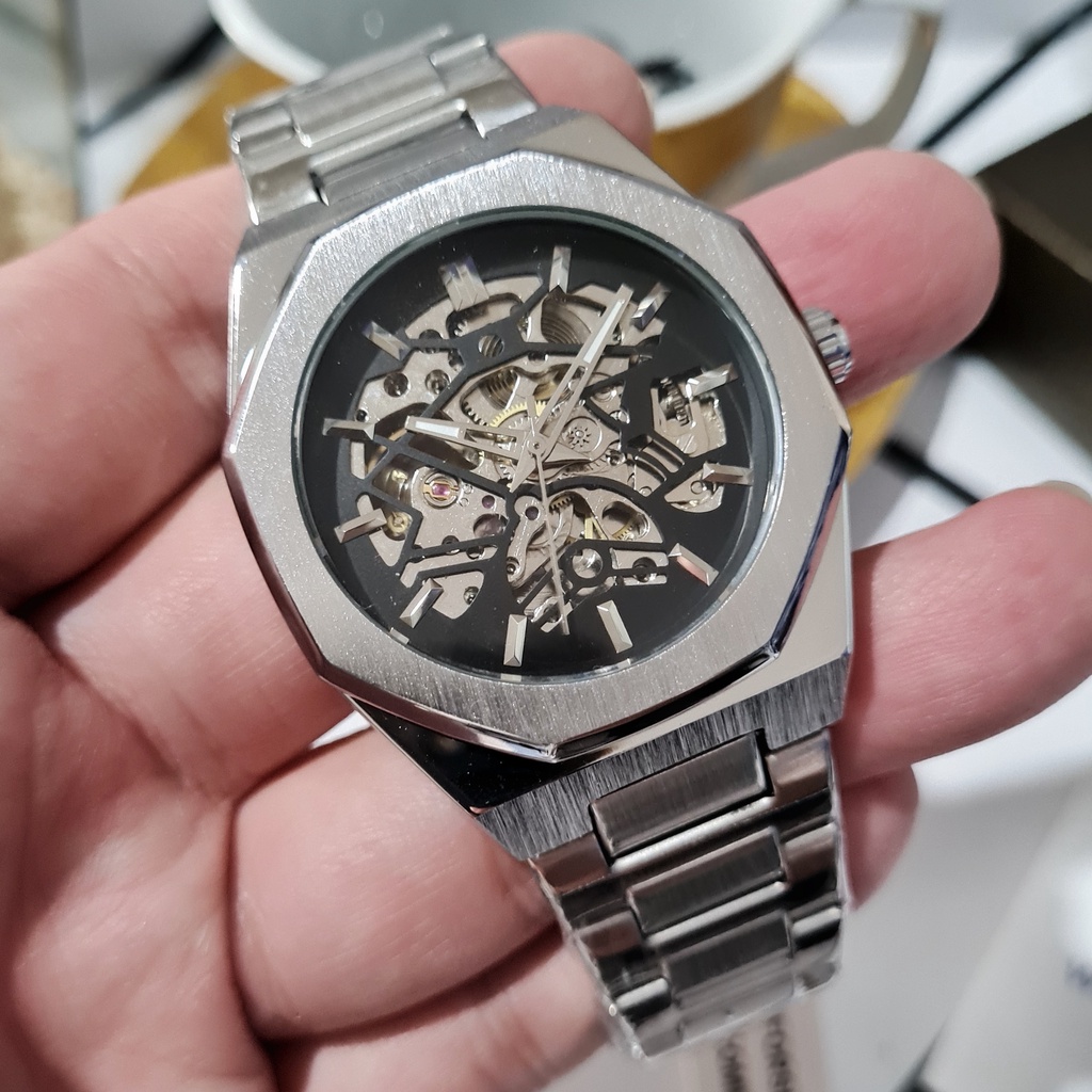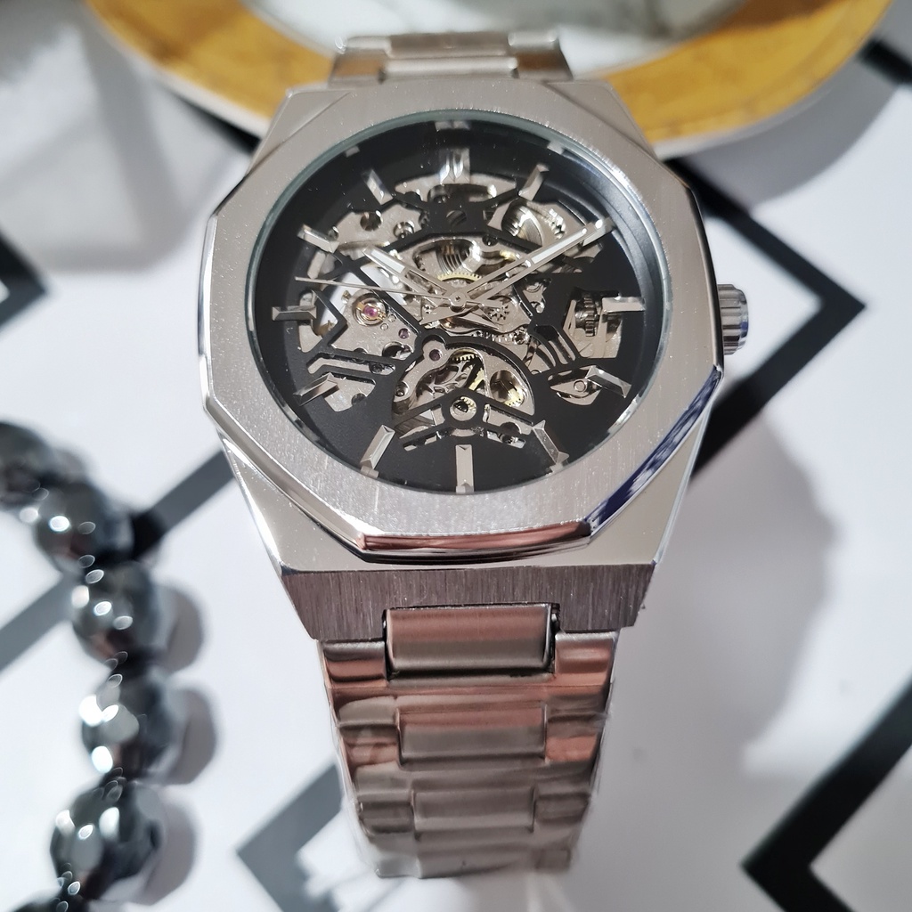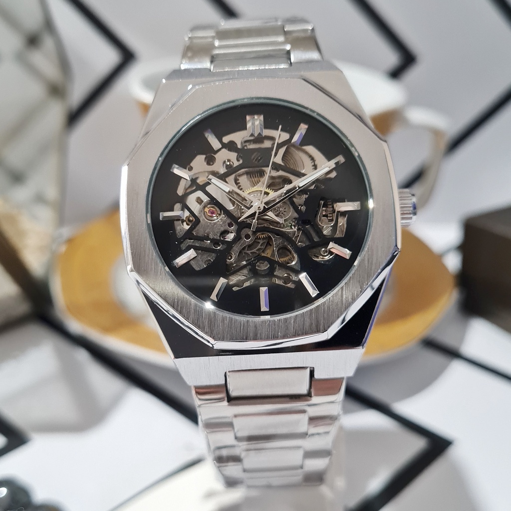 FORSINING Enigma Silver Jam Tangan Pria Original Automatic Otomatis Mechanical Mekanik Beri Rantai Stainless Steel Skeleton Anti Air