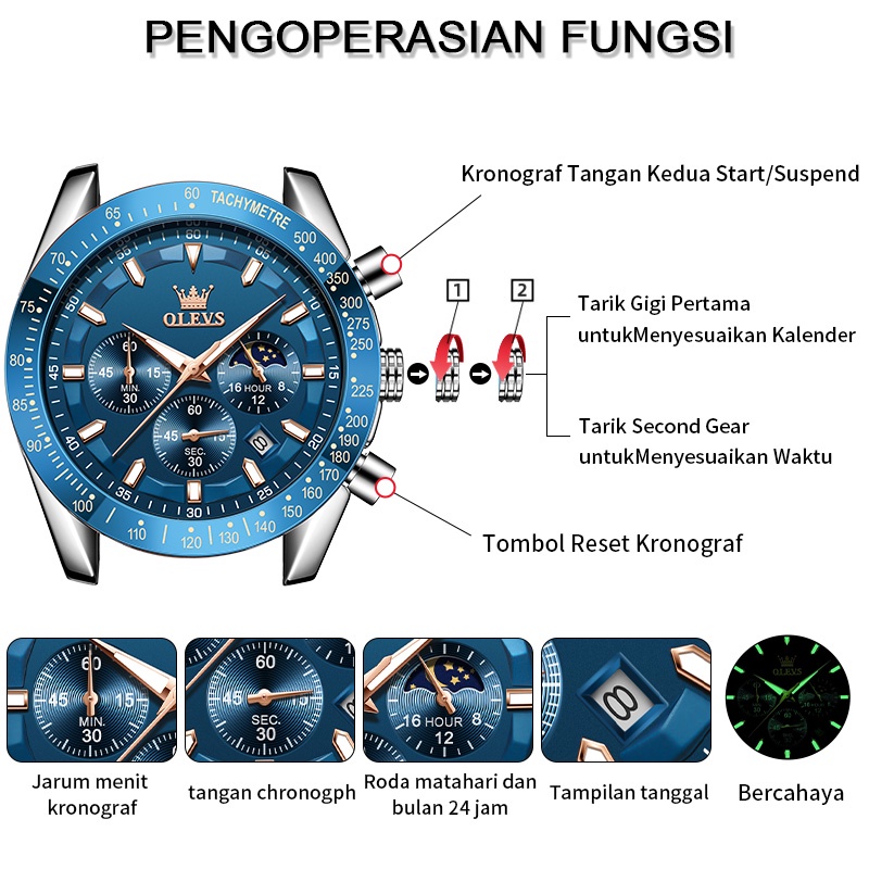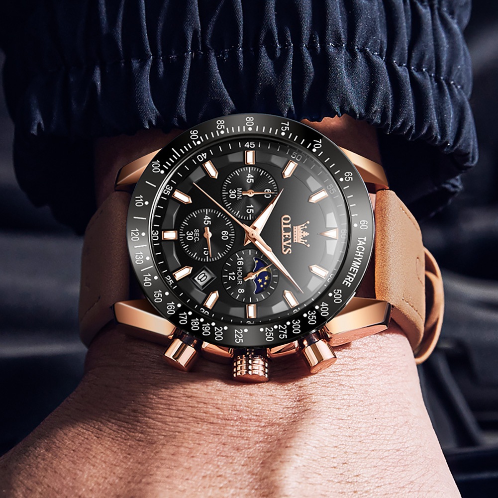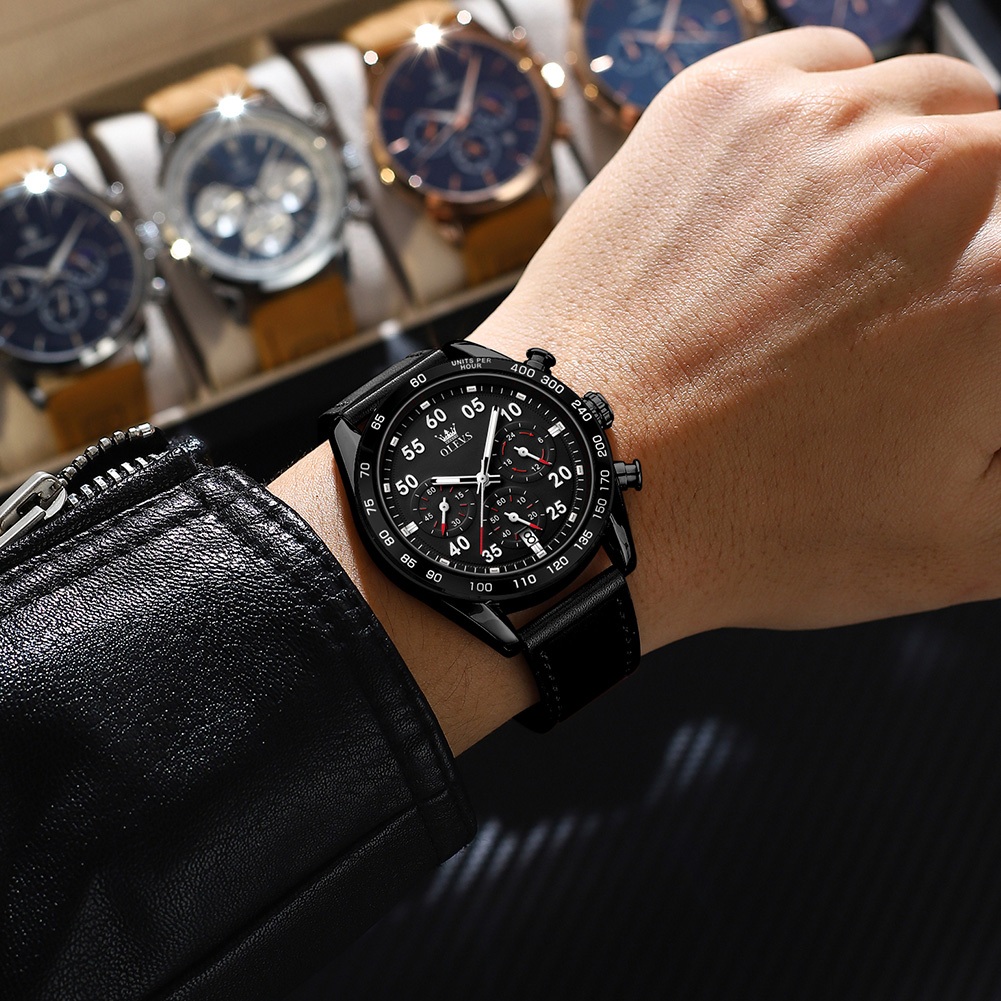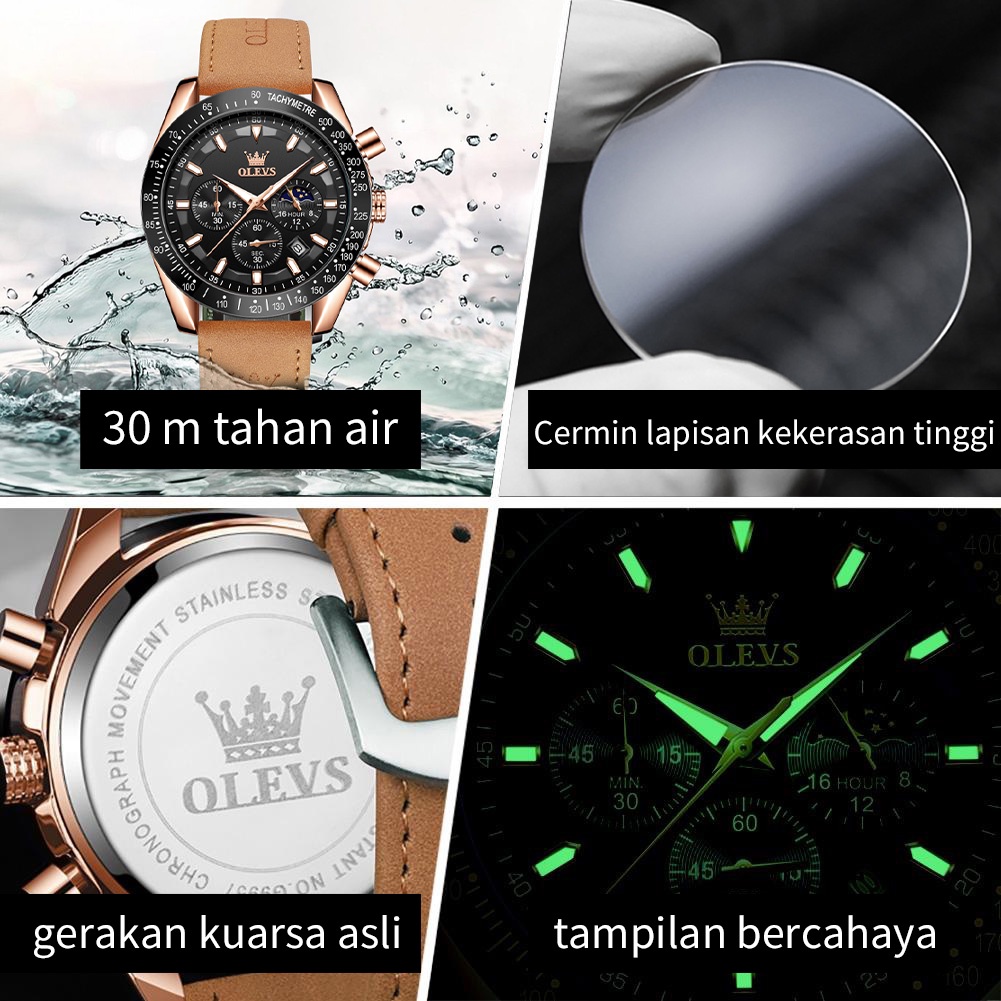 OLEVS Jam Tangan Pria Original Anti Air Kulit Tahan Keren Led Hitam Luxury Chronograph Watch Men Multifungsi Model 9957