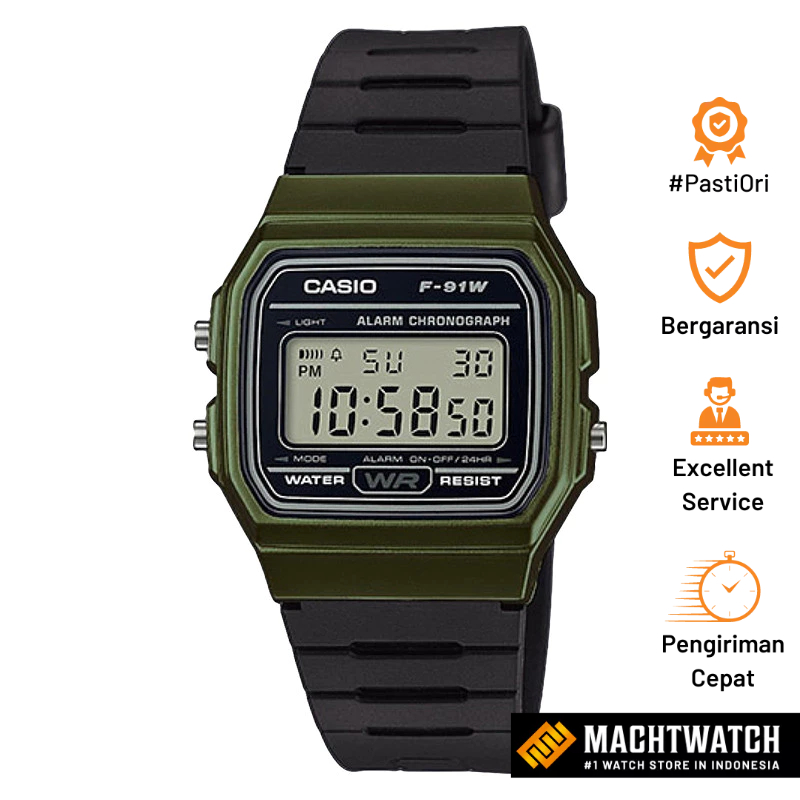 Jam Tangan Unisex Digital Casio General F-91WM-3ADF F91WM Dial Black Resin Band
