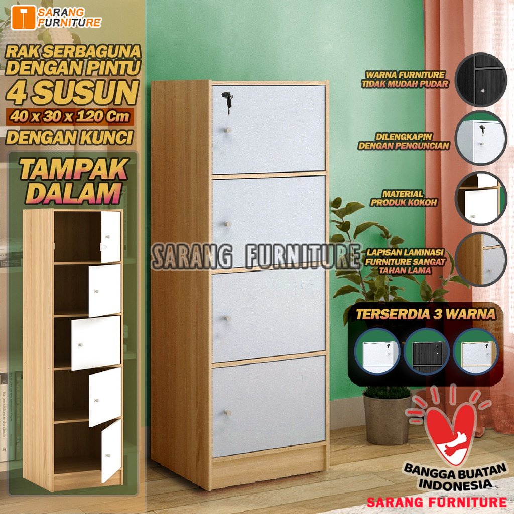 LEMARI RAK BUKU SERBAGUNA SUSUN 4 KAYU DENGAN KUNCI RSG PINTU 4 SUSUN