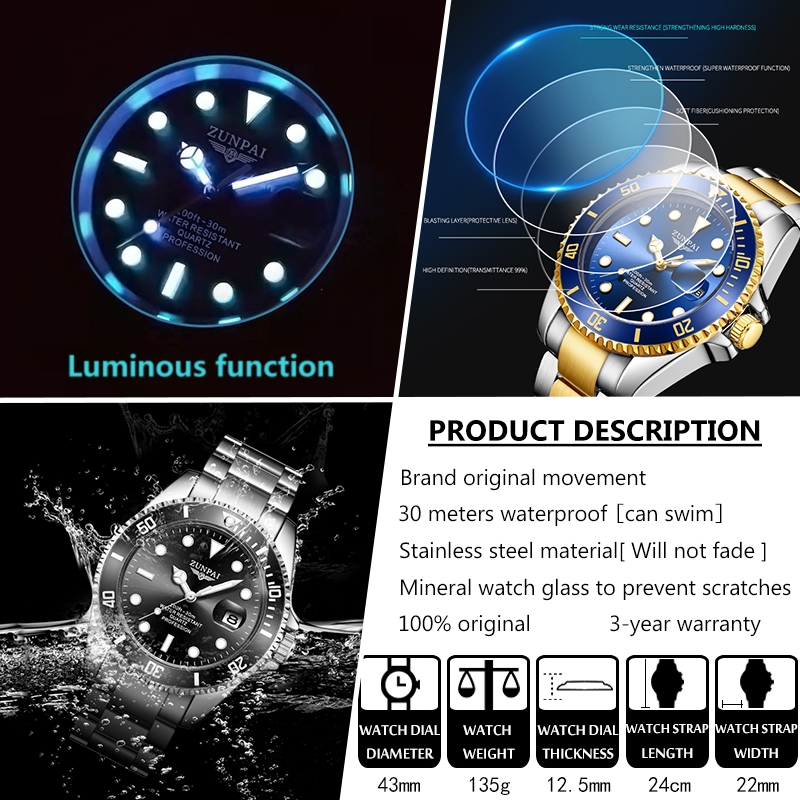 ZUNPAI Jam Tangan Pria Asli Anti Air Keren Mewah Bisnis Kalender Bercahaya Baja Tahan Karat Jam Pria Populer Kotak Hadiah Pria