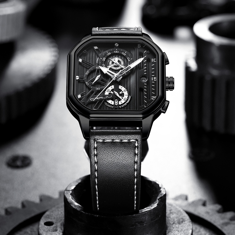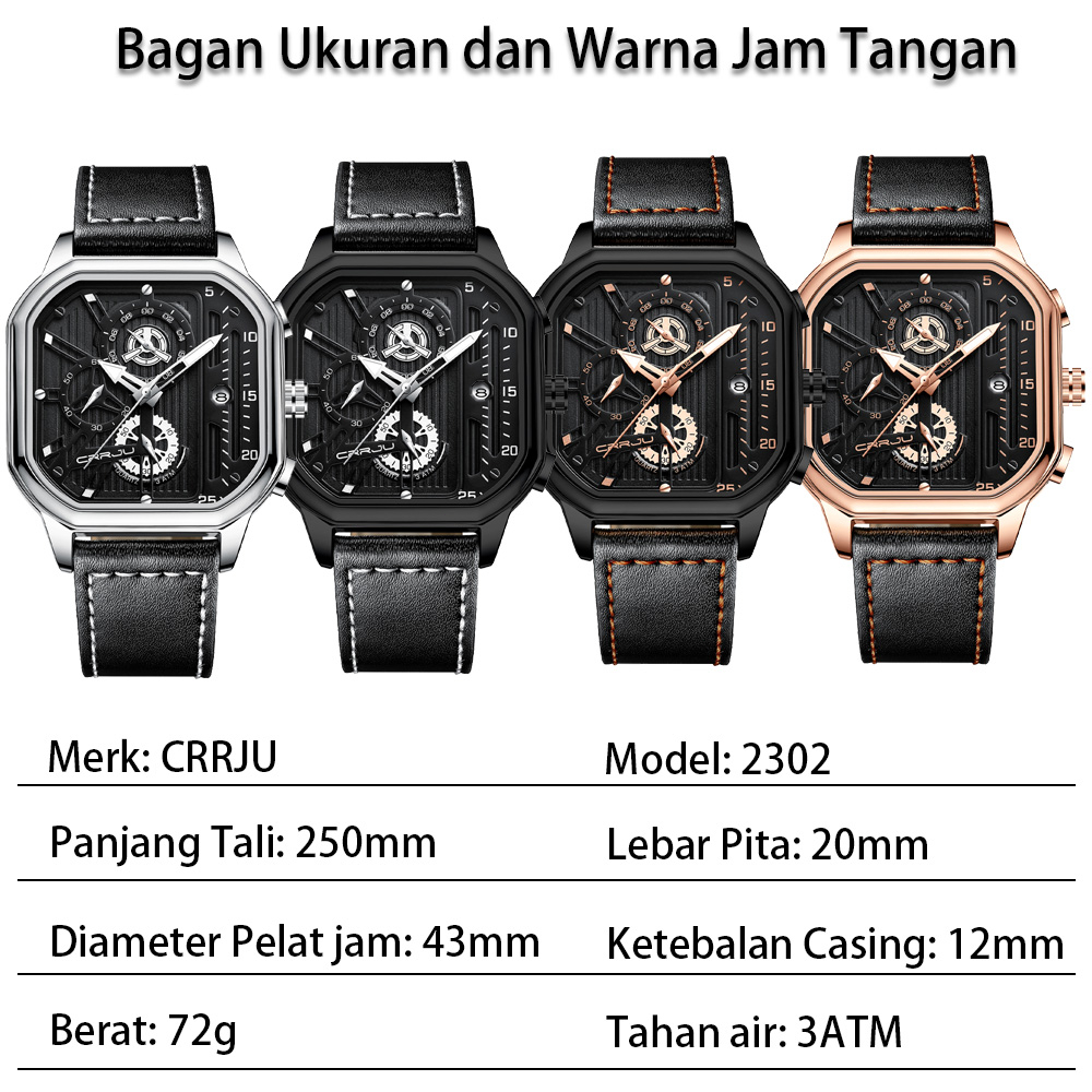 CRRJU Fashion Square Dial Kulit Jam Tangan Pria Mewah Olahraga Tahan Air Watch Man Chronograph Quartz Jam Tangan + Kotak