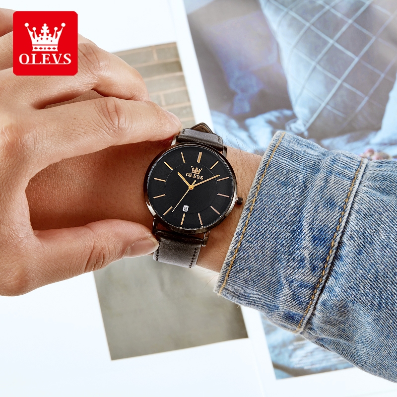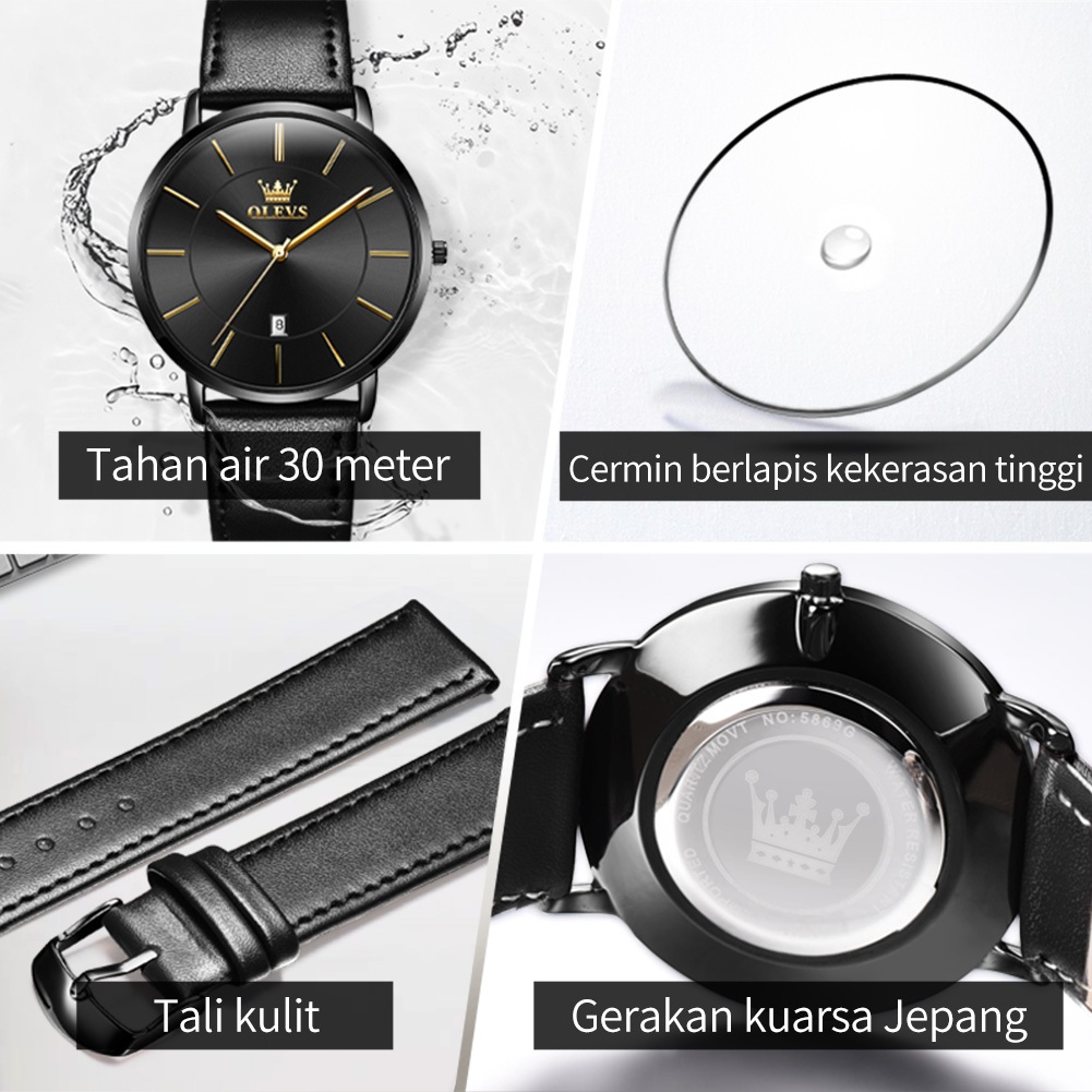 OLEVS Jam Tangan Pria Anti Air Original Ultra Tipis Analog Kalender Tahan Tali Kulit Kuarsa Asli Hitam 5869