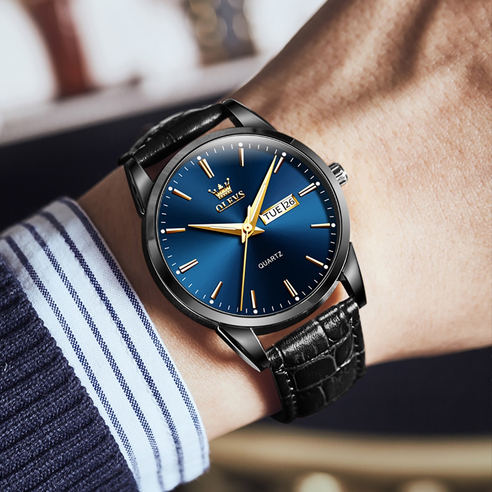 OLEVS Jam Tangan Pria Original Anti Air Tahan Kulit Analog Men Watch Hitam Putih Biru