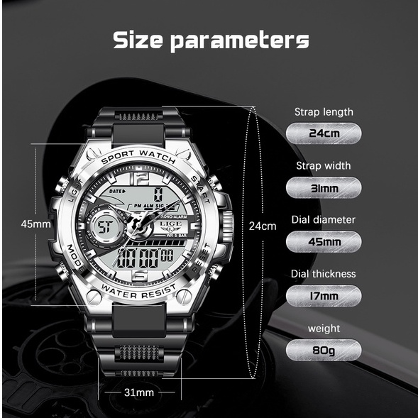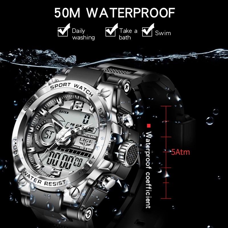 LIGE Jam Tangan Digital Pria Multifungsi Arloji Bercahaya Waktu Ganda Kalender Jam Tangan Elektronik + Kotak