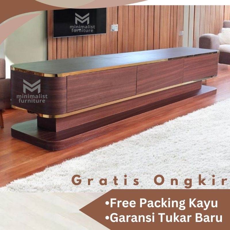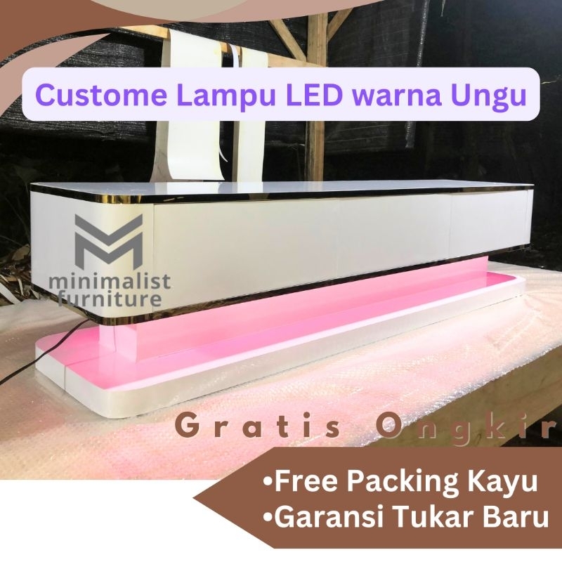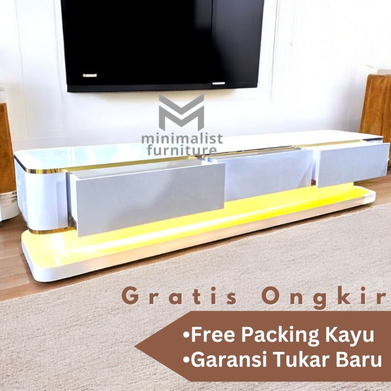 Meja TV Minimalist Modern Putih List Gold Dengan Lampu LED
