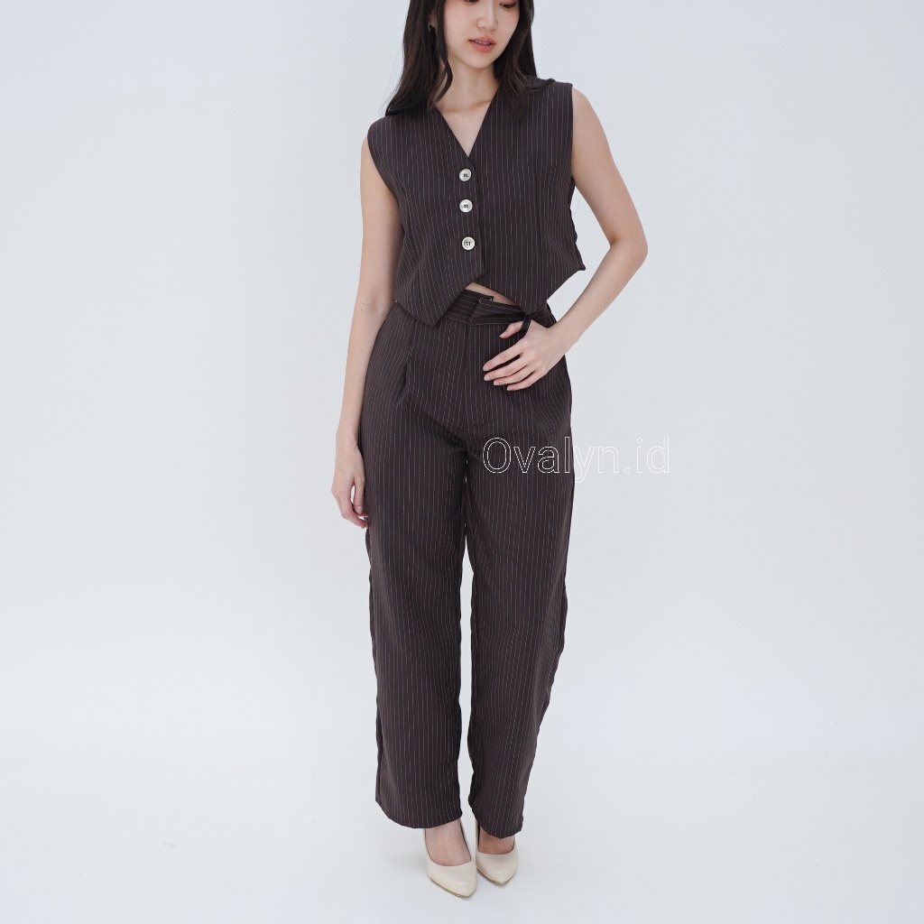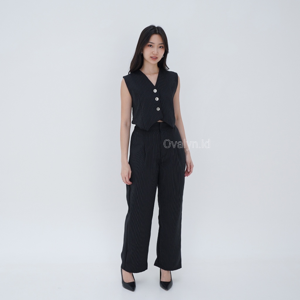 Yuriko One set Vest & Stripe Pants Setelan Wanita Kain Semiwool Stripe Premium Korean Style - Ovalyn.id