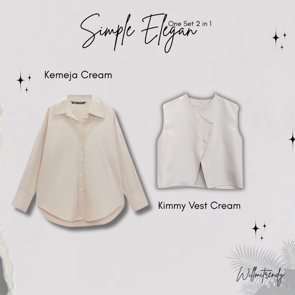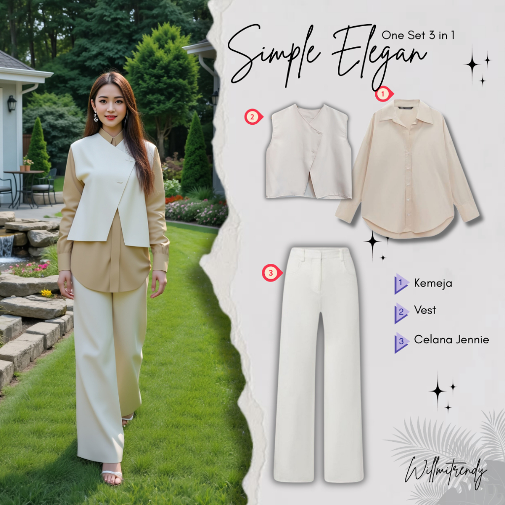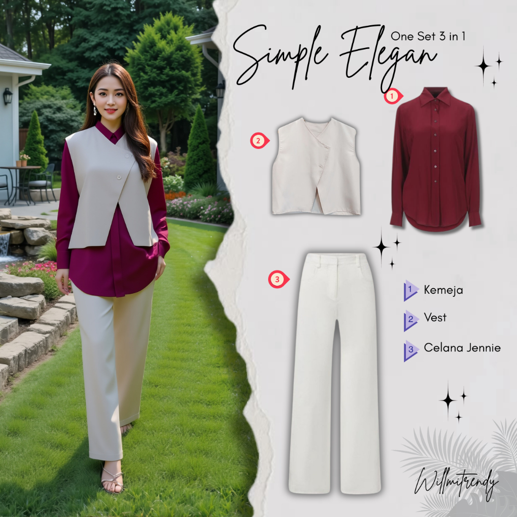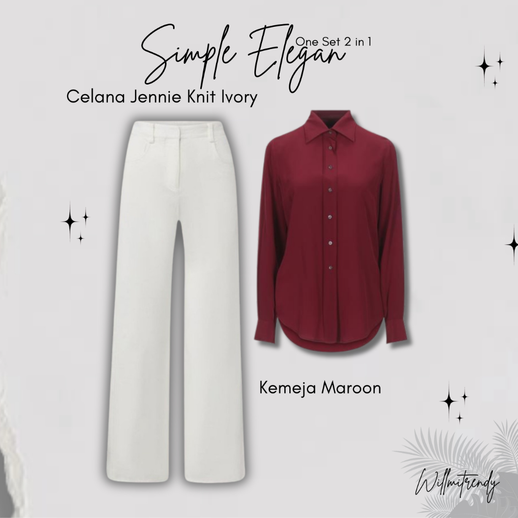 Set Fashion Stylish Kemeja Maroon + Kimmy Vest Cream + Celana Jennie Knit Ivory Outfit Hijab Kekinian Chic
